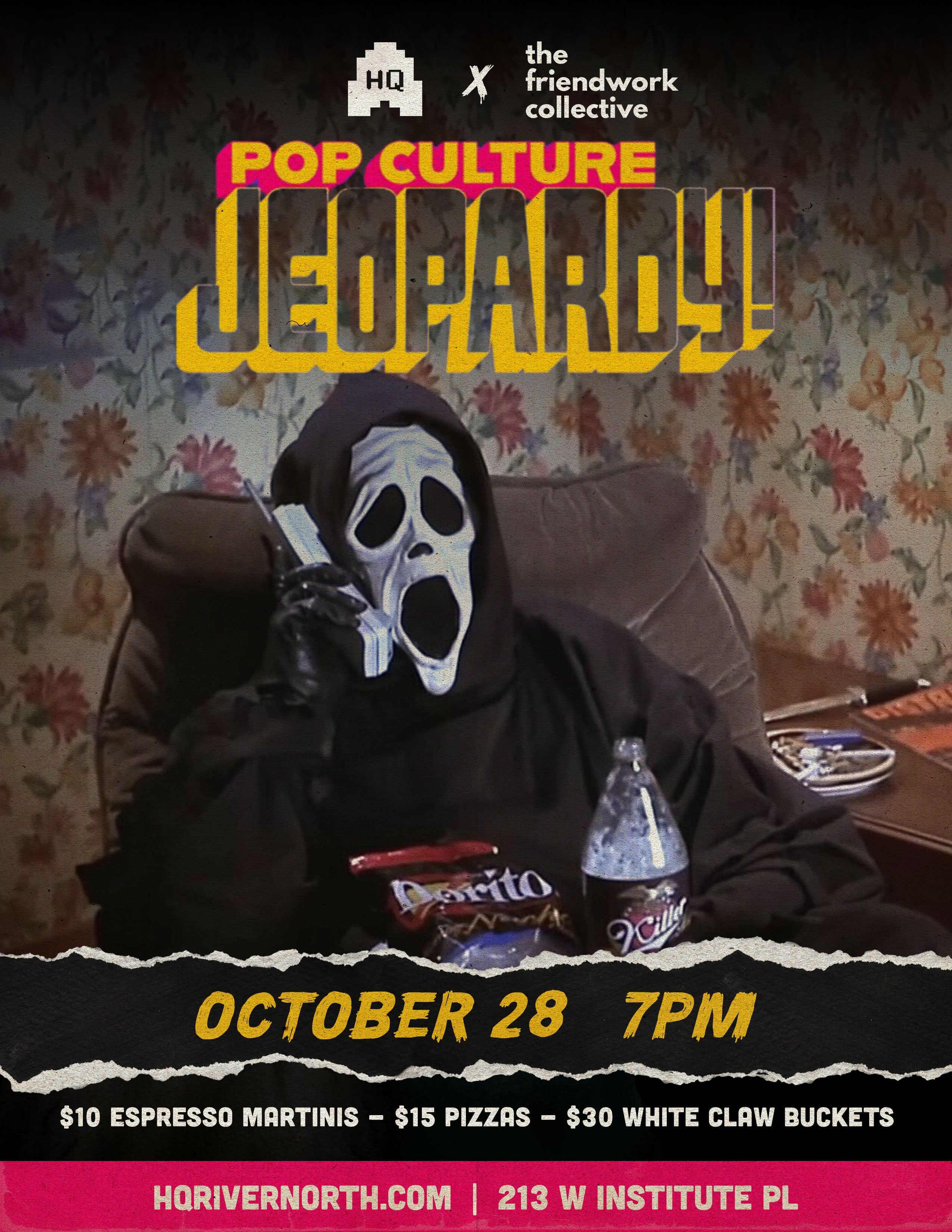 description: Join us for another round of Pop Culture Jeopardy led by host Carter Weiss in our spooky Halloween edition on 10/28! Come alone, or come in a team! Either way, you’ll had the option to expand your team by being paired with strangers who just become some of your next best friends! The winning team will receive a $200 gift card alongside a free shot.
