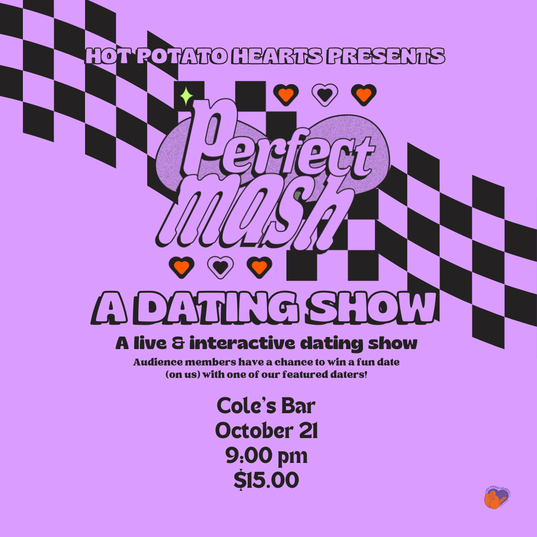 description: Perfect Mash is a dating show where audience members vie to win a date with one (or two… or three…) of three sexy contestants. Each contestant is hand-selected by our Mother Potato, Katie, and publicized beforehand on social media for everyone’s viewing pleasure. At the show, audience members can take a low-key, fun compatibility quiz for whoever catches their eye. If you score in the top two, you’ll head up on stage to answer questions from your potential Perfect Mash. Each contestant then chooses who they want to go on a date with based on their favorite response.