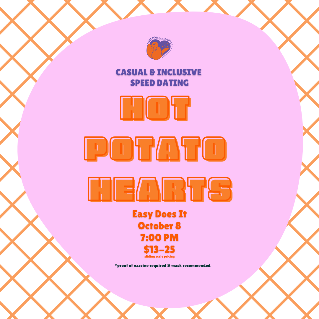 description: Hot Potato Hearts is an inclusive community focused on building meaningful connections in low-pressure, casual safe spaces. Our speed dating is just like typical speed dating. You go on multiple 5 minute dates, anonymously write down who you like, & get emailed your matches the next day. However, at Hot Potato Hearts, we invite people of all genders and sexualities to date. We do not pair people based on their sexual orientation; who you date is completely random, so you can get a romantic date or make some new friends! Our goal is to create a welcoming, fun, inclusive, & relaxed environment at all our events for cultivating relationships—whether romantic or platonic. Born from the heart of a queer woman, Hot Potato Hearts is & always will be a space for all genders, all sexualities, all races, & all abilities. Follow @hotpotatoheartshotpotato on Instagram for updates.