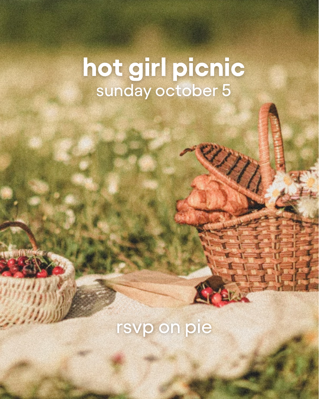 description: we’re rolling out our favorite summer fits and picnic blankets (and swimsuits if you’re brave!) one last time before the end of the season! bring a favorite charcuterie item to share and be ready to make new friends for the fall. ladies only. see you there 🫶🏻