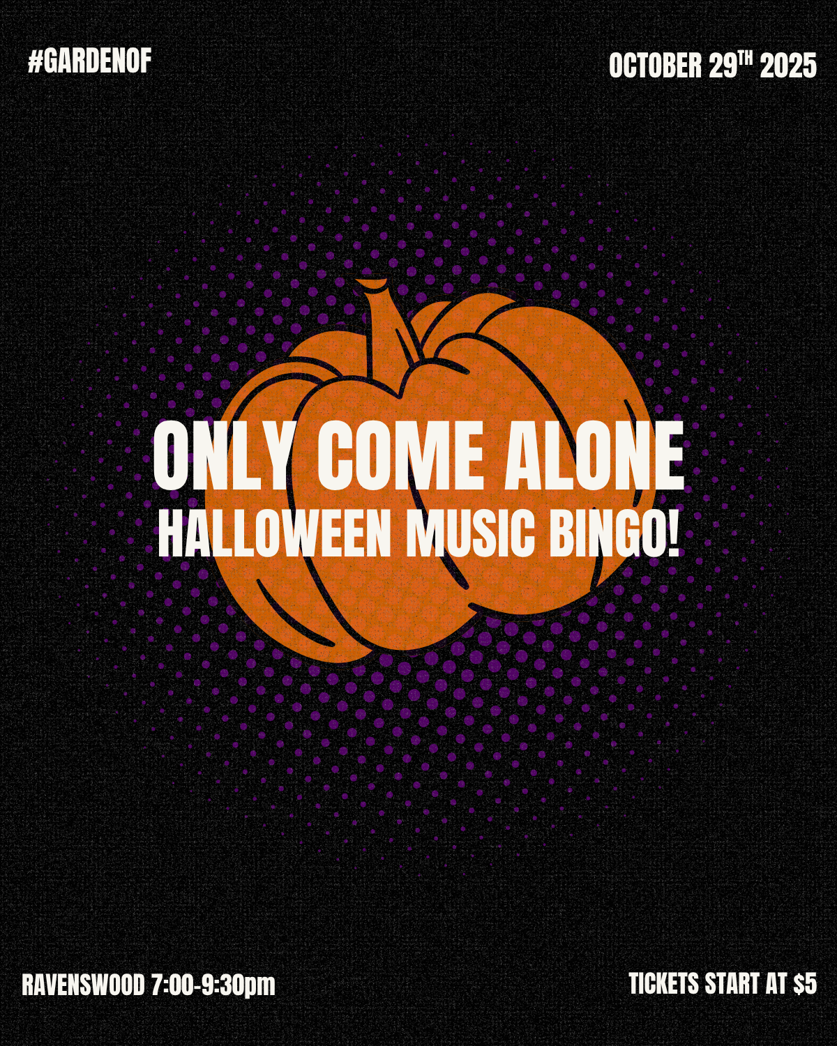 description: Lesbians + sapphics to the front. This event is ONLY FOR PEOPLE BRAVING TO COME ALONE! I know so many of you have been a bit nervy about coming alone and making friends, so guess what? We're all coming alone. This time we're doing Halloween Music Bingo for the first hour -- then doing a social hour after!! See you there, THIS IS A SOBER EVENT, as always. Buzz 101 when you arrive. xx Please note: content may be captured for future Garden Of promotions. By attending, you consent to being photographed or filmed. Come follow along for future events @gardenof.collective! Tickets are non-refundable.