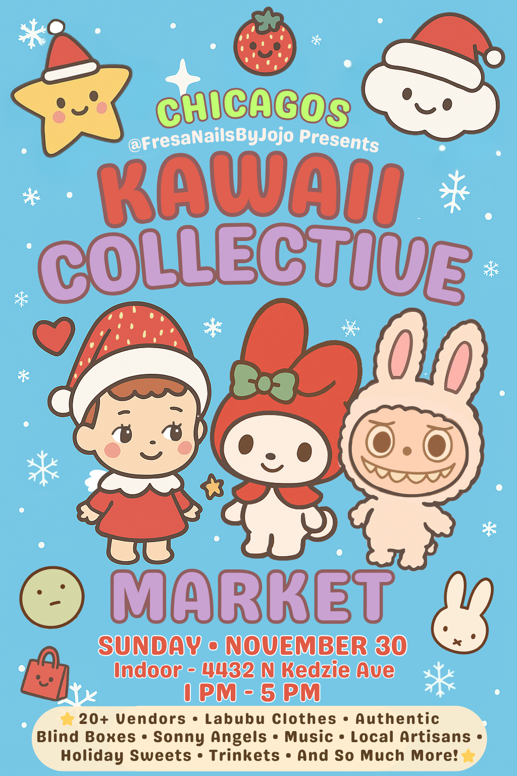 description: Follow us for more updates! IG: @fresanailsbyjojo / @fresafestsbyjojo โ๏ธโจ Chicago, are you ready?! โจ๐ The First EVER ๐ KAWAII COLLECTIVE HOLIDAY MARKET is here!! ๐โจ ๐งฃ A magical winter pop-up full of Labubu lovers, Sonny Angel collectors, local artisans, Trinkets, and holiday cheer! โ itโs the cutest way to kick off the season! ๐ โ๏ธ Shop small and Check Off Your Holiday Gift List! ๐๏ธ What youโll find at the Kawaii Collective Market: ๐ธ 20+ Vendors bringing all the cozy-cute vibes โAuthentic Collectibles & Blind boxes ๐ Sonny Angels ๐งธ Labubu Clothes & Accessories ๐ถ Amazing Music & Local Artisans ๐ฐ Holiday sweets & drinks ๐ Trinkets, Jewelry, and SO much more! ๐ Location: 4432 N Kedzie Ave, Chicago, IL ๐ Date & Time: Sunday, November 30 | 1PM โ 5PM ๐ Indoor โข All Ages โข Free Entry! ๐ RSVP TO GET FREE ENTRY & Bring your friends, dress cozy-cute, and shop small while discovering Chicagoโs most adorable holiday market! โ๏ธโจ ๐ Donโt miss out and market your calendars! โ this is your one-stop shop for cute gifts, collectibles, and festive fun! ๐๐ ๐ฒ Follow along @fresanailsbyjojo / @fresafestsbyjojo on IG & share with your besties! ๐ ๐งค๐ฉต Hashtags: #KawaiiCollectiveMarket #ChicagoEvents #WinterChicago #HolidayMarket #ChicagoPopUp #Trinkets #TrinketLovers #KawaiiChicago #ShopSmallChicago #LabubuLovers #SonnyAngelFans #BlindBoxAddict #ChicagoTrinkets #ChicagoMarket #KawaiiPopUp #ChicagoHolidayMarket #ChicagoThingsToDo #SupportSmallBusiness #ChicagoArtisans #WinterInChicago #WinterMarketChicago #HandmadeChicago #ChicagoMakers #IndieArtists
