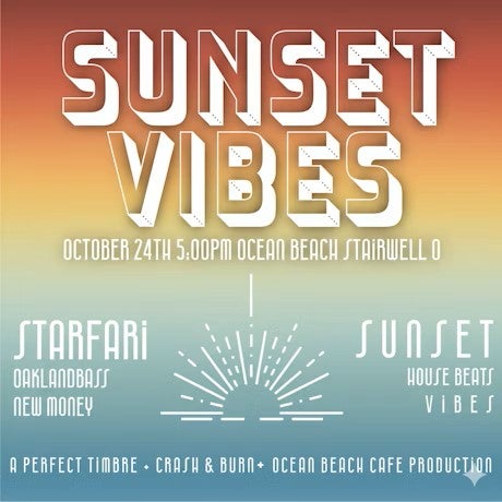description: Ocean Beach Café, in collaboration with Crash and Burn / Perfect Timbre Productions, is excited to present a sunset beach party featuring an incredible lineup of DJ sets. Featured DJs Starfari OaklandBass New Money What to Expect Sunset soundscapes Free tastings of functional non-alcoholic beverages, including: CBD drinks Kava elixirs And more! Rhythms of the waves What to Bring Your crew Good energy A jacket (it might get chilly!) Where to meet Stairwell near the Cliff House Join us for an unforgettable evening of coastal magic!