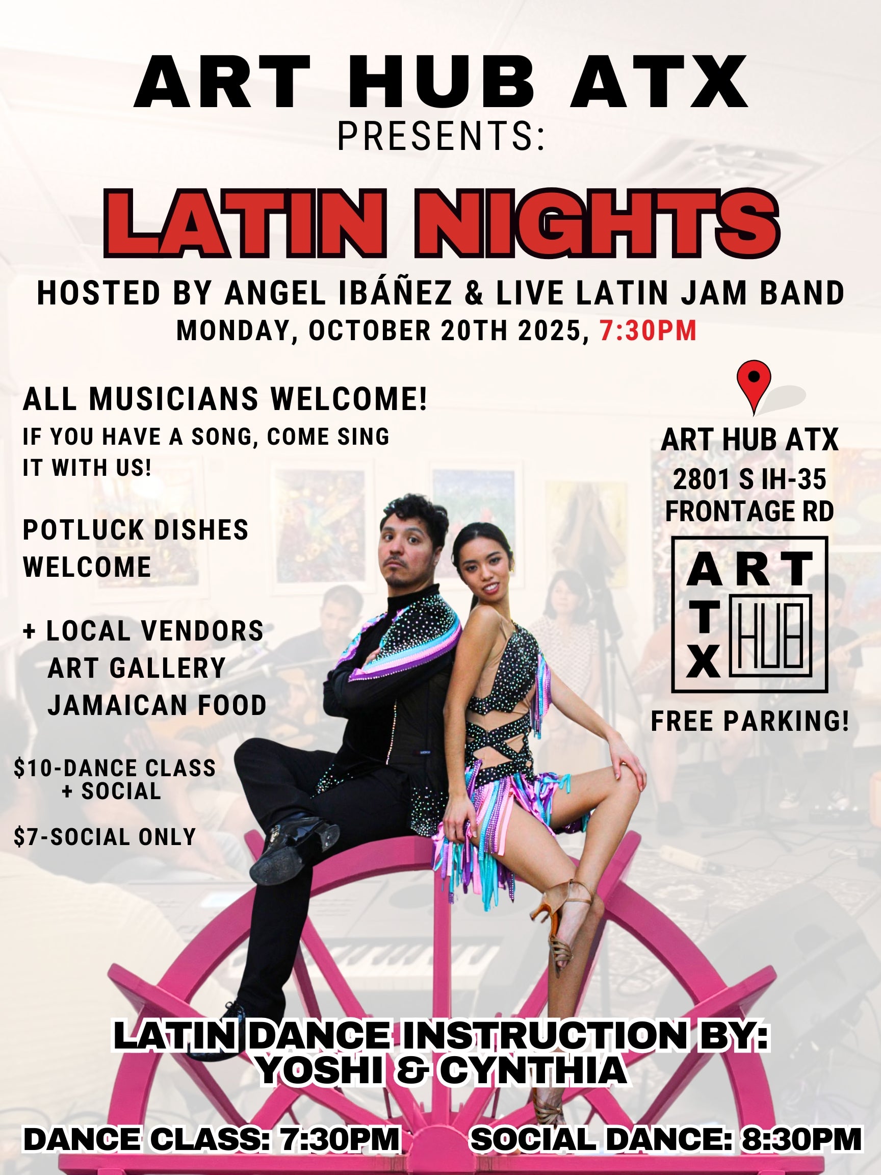 description: Back by popular demand! π Latin Night returns Monday, October 20th at ART HUB ATX! β€οΈβπ₯πΆ Head over to @arthubatx for Latin World Jam Night on Monday, October 20th from 7:30PM-11PM! Schedule: 7:30 PM Beginner Cumbia Class 8:30-11:00 PM Live Latin Jam Band + Social Dancing -NO PARTNER NEEDED- π₯ Dance Instruction + Social Latin dancing, Open World Music Jam, Vendor Market, Art Gallery, Drinks, Food and more! Jamaican food dishes will be served, and more potluck dishes are welcome! Bring your best dishes to share and fuel up with before you hit the dance floor π½οΈ πͺ© Dance. Jam. Shop. Eat. Drink. Repeat. π₯ No registration required, just pop in and join the celebration! ποΈ Monday, October 20th β° 7:30PM-11:00PM πΆ Social Dancing | Latin Open Jam | Vendor Market π° Cover: $10 dance class + social dance, $7 for social only πART HUB ATX (2801 S IH-35 Frontage Rd) π Free Parking!