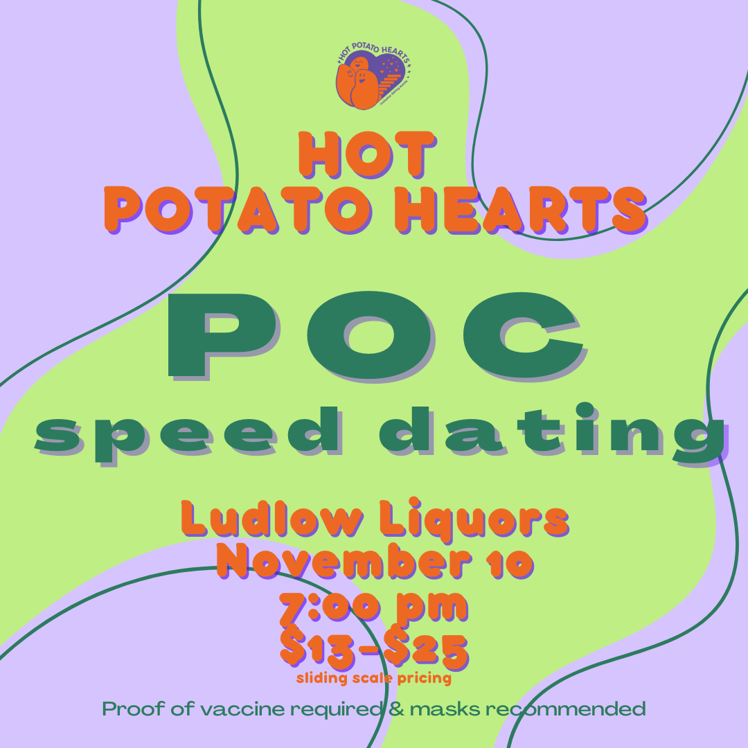description: Hot Potato Hearts is a platform & community for people of all backgrounds & we are excited to announce our newest event. POC speed dating, this event is for people of color only. Hot Potato Hearts Speed Dating is just like typical speed dating. You go on multiple 5 minute dates, anonymously write down who you like, & get emailed your matches the next day. However, at Hot Potato Hearts, we invite people of all genders and sexualities to date. We do not pair people based on their sexual orientation; who you date is completely random, so you can get a romantic date or make some new friends! Hot Potato Hearts is an inclusive community focused on building meaningful connections in low-pressure, casual safe spaces. Our goal is to create a welcoming, fun, inclusive, & relaxed environment at all our events for cultivating relationships—whether romantic or platonic. Born from the heart of a queer woman, Hot Potato Hearts is & always will be a space for all genders, all sexualities, all races, & all abilities. Follow @hotpotatoheartshotpotato on Instagram for updates.