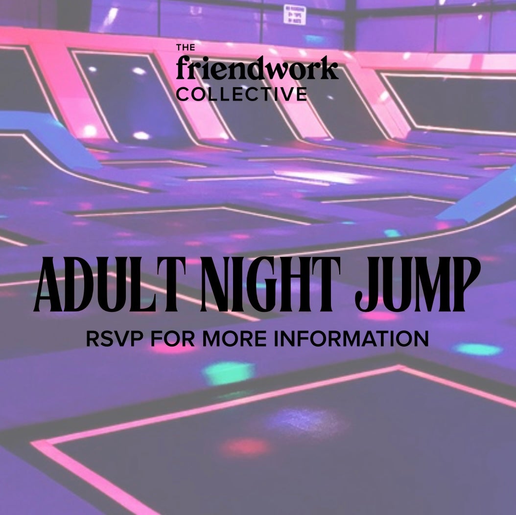 description: Enjoy another night jump with The Friendwork Collective. Whether you’re looking to jump around or make new friends, we’ve got you covered with the ultimate night out that’ll make you feel like a kid again. Please note that jump times are from 7:30-8:30PM. 30+ Trampolines Trampoline Basketball Extreme Dodgeball Foam Pits Trapeze Swing Rock Wall Wipeout & More!