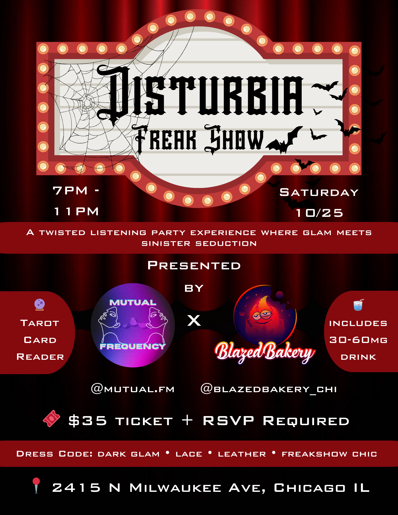 description: 🎪 Welcome to Disturbia 🎪 Step right up to the freak show of the season—where dark glam meets twisted desire. This isn’t just a party, it’s a listening experience designed to pull you deep into the night. Your $35 ticket includes: ✨ One infused drink to set the tone ✨ Early entry for first access to the madness ✨ Free samples all night to keep the energy flowing Expect a seductive but sinister atmosphere, with music that shifts from pulsing EDM to sexy rock, heavy metal, and even eerie Halloween classics. Explore interactive elements throughout the night that blur the line between good and evil. Dress to disturb: lace, leather, dark glam, and freak-show chic encouraged. The bolder, the better. 🔮 Disturbia is more than a party—it’s where the night takes over you.
