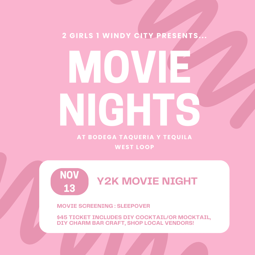 description: Y2K Movie Night: Sleepover + DIY Cocktail Party We're throwing it way back with a night full of nostalgia, cocktails, and classic slumber party vibes! Grab your Juicy tracksuits, roll on some body glitter, and join us for a special screening of the ultimate early 2000s flick - Sleepover $45 Ticket Includes: ➡️Screening of Sleepover ➡️Access to our Create Your Own Cocktail station with Broda ➡️Entry to our Y2K pop-up market featuring: Retro clothing vendors with the best early-2000s fits, Permanent jewelry to keep your sparkle going, Hair tinsel station to shimmer like it's 2004 Doors open at 6:30 PM — come early to shop, vibe, and start crafting your cocktails Cocktail making runs from 6:30-7:30 PM in 15-minute shifts - first come, first served!