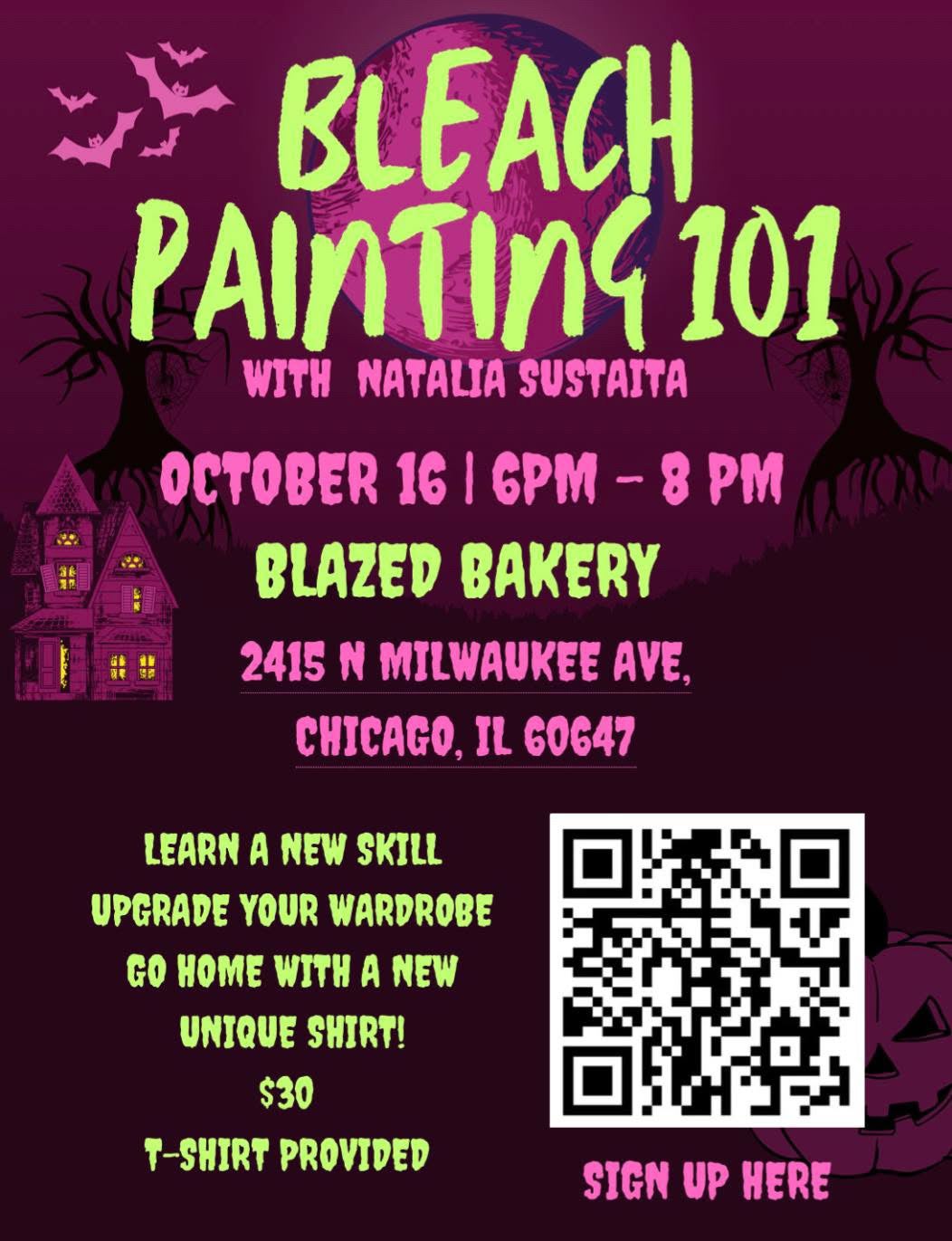 description: πβ¨ Ready to flip your wardrobe? Join us at Blazed Bakery for an Upcycling & Fashion Night π¨ Learn bleach art techniques, customize your own tee, and take home a one-of-a-kind piece you designed! π Thu Oct 16 β’ 6β8PM π 2415 N Milwaukee Ave, Logan Square ποΈ $30 (includes a black T-shirt!) π« No walk-ins β sign up by Oct 14! Tag your creative crew π―ββοΈ and letβs make fashion magic π₯