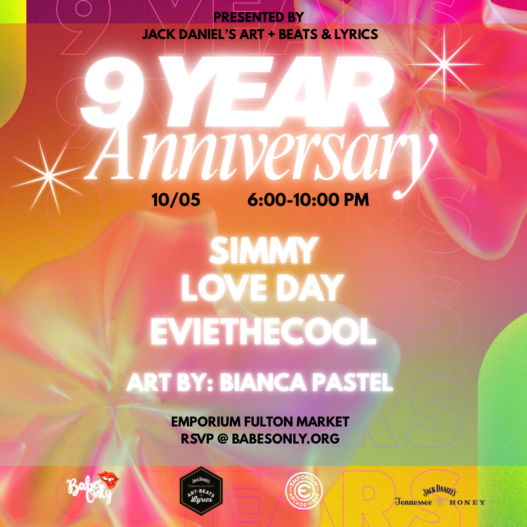description: This Sunday marks a very special day for us—our 9-year anniversary! After more than 3,000 days of supporting women from all over, we are excited to partner with Jack Daniel’s Honey to host this joyous occasion. As part of the celebration for the Art + Beats & Lyrics project, we will feature live art by Bianca Pastel. Enjoy curated cocktails and music sets by Love Day, EvieTheCool, and Simmy. We hope you can join us in this celebration!