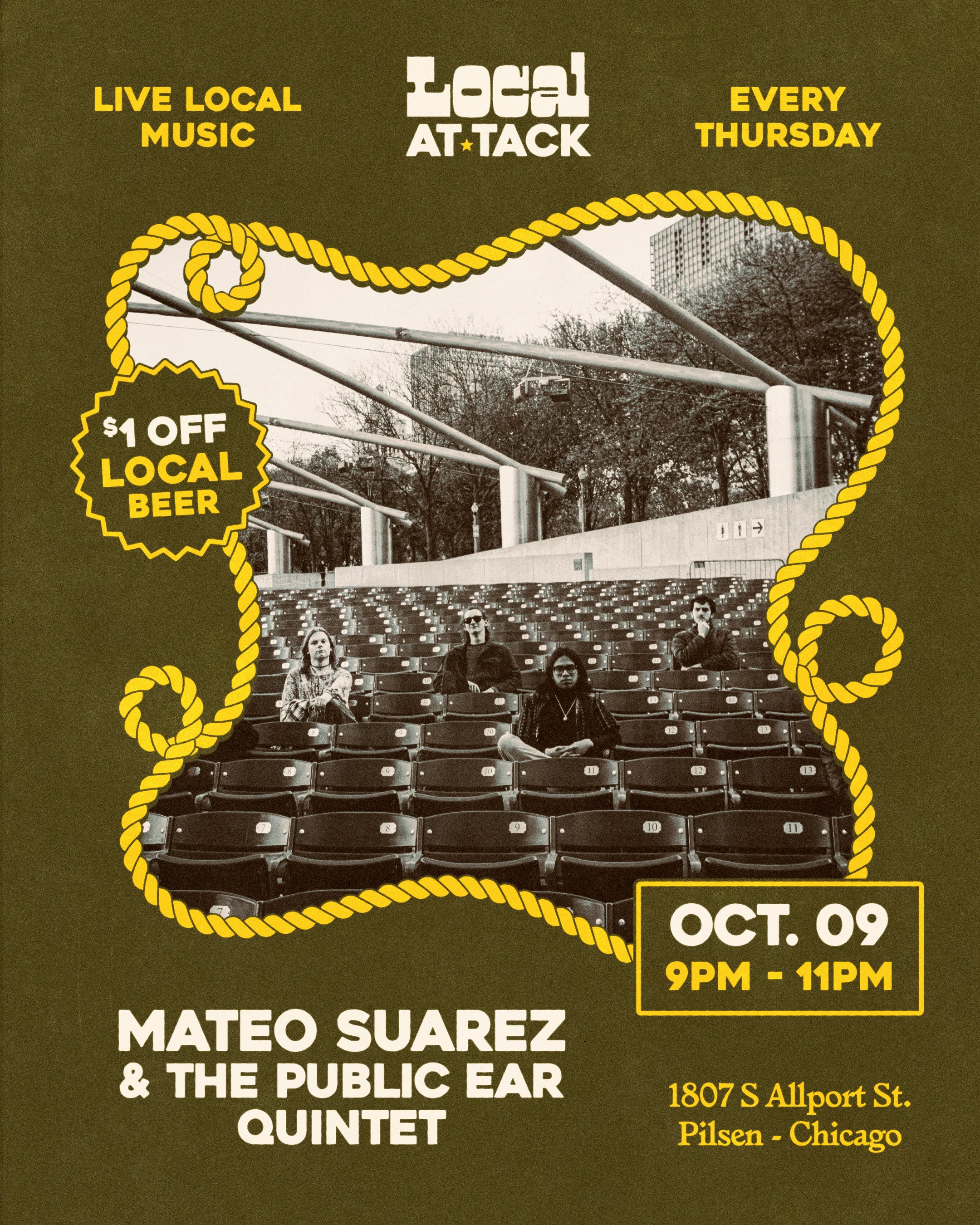 description: Join us every Thursday for local music acts & $1 off local beers. This time around there will be music from Mateo Suarez & The Public Ear Quintet from 9pm-11pm. MATEO SUAREZ & THE PUBLIC EAR IS A JAZZ-CENTERED FUSION GROUP, OUT OF DIFFERENT WALKS OF LIFE ALL THROUGHOUT CHICAGO. THE GROUP PUSHES JAZZ, ROCK, AND FUSION FORWARD IN A DIFFERENT AND MORE ACCESSIBLE WAY INTO THE AVANT-GARDE.