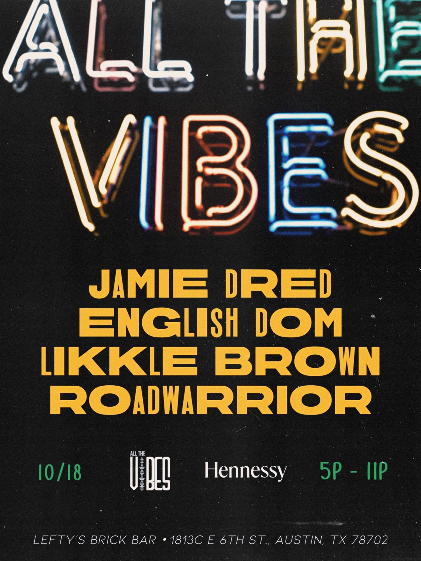 description: All The Vibes returns for F1 weekend to Lefty's Bar for a night of great music, giveaways, and amazing specials courtesy of Hennessey. ๐จ All The Vibes is BACK for a special pop-up @ Leftyโs Brick Bar ๐จ Presented in partnership with Hennessy ๐ฅ๐ฅ Grab your crew and get ready for the ultimate dance party featuring some of the hottest DJs in Central Texas! Expect an electric mix of RnB, Afrobeats, Dancehall, Soca, Amapiano & more all night long. ๐ถ๐๐พ๐บ๐พ ๐ง On the decks: JAMIE DRED ENGLISH DOM LIKKLE BROWNE ROADWARRIOR ๐ค Hosted by MDM โจ Special Hennessy Takeover โจ ๐ธ Discounted Hennessy cocktails all night long ๐ฅ FREE limited Hennessy samples โ so pull up early! ๐ด Delicious bites to keep you fueled ๐ Vibes on 100 from start to finish YKTV: Pull up dressed to impress โ Leftyโs is a beautiful venue, and the energy will be unmatched! ๐ค