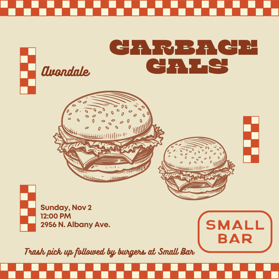 description: We are headed to Avondale for our final clean up of the year! We will be meeting outside of Small Bar before starting the clean up. After a 45 minute clean up, we will head into Small Bar to enjoy delicious burgers and drinks! WHAT WE WILL PROVIDE: We provide all the equipment/supplies necessary. That includes gloves, trash bags, buckets, and trash grabbers. WHAT TO EXPECT: We will give a 15 minute grace period for arrival. If you arrive after the designated time, please locate the nearest Garbage Gal and see if you can join them! The trash pick ups usually last about 1 hour. The Garbage Gals are not responsible for any lost items, damaged personal property, bodily injuries, or otherwise for the duration of the event. If you have any questions, please feel free to reach out to our team directly at garbagegalschicago@gmail.com We look forward to meeting and can't wait to see you there!