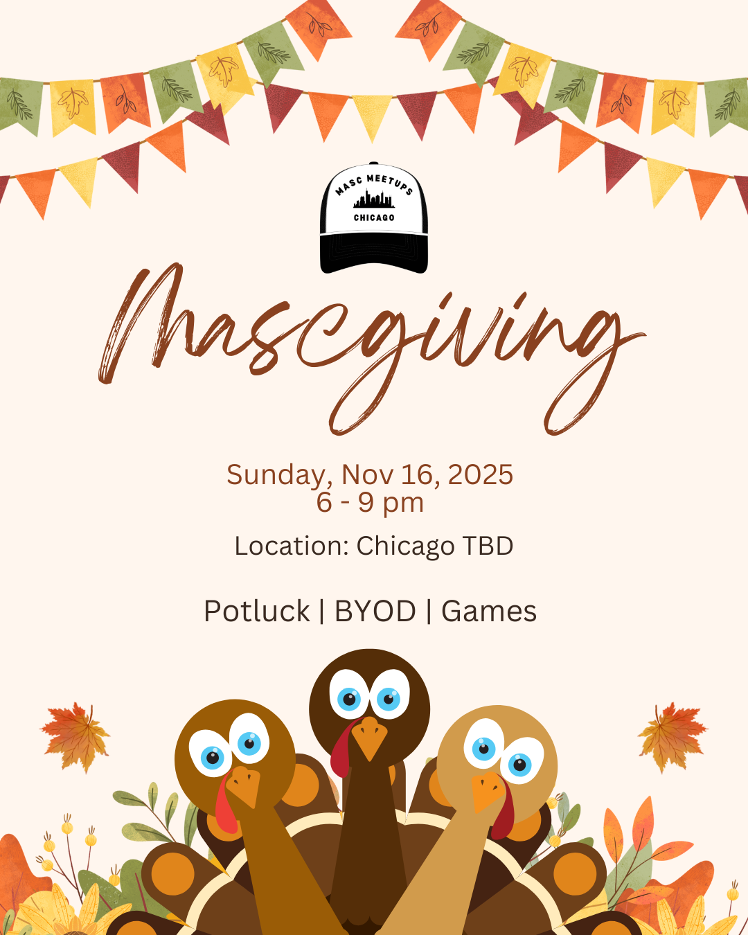 description: Please ONLY RSVP if you are locked in on coming! Mascs only, this is an opportunity to connect and build community with eachother. There are 8 spots with a total of 10 of us. *This meetup will only run if at least 5 can attend.* Location will be somewhere in Chicago depending on size of group. We will stay up to date via groupchat in the Pie app. Make sure to fill out what you’re bringing for the potluck on the excel sheet link. This is a team effort so please bring something! BYOD (bring your own drink) Water and table set up provided. Music and games to follow! 🦃😃