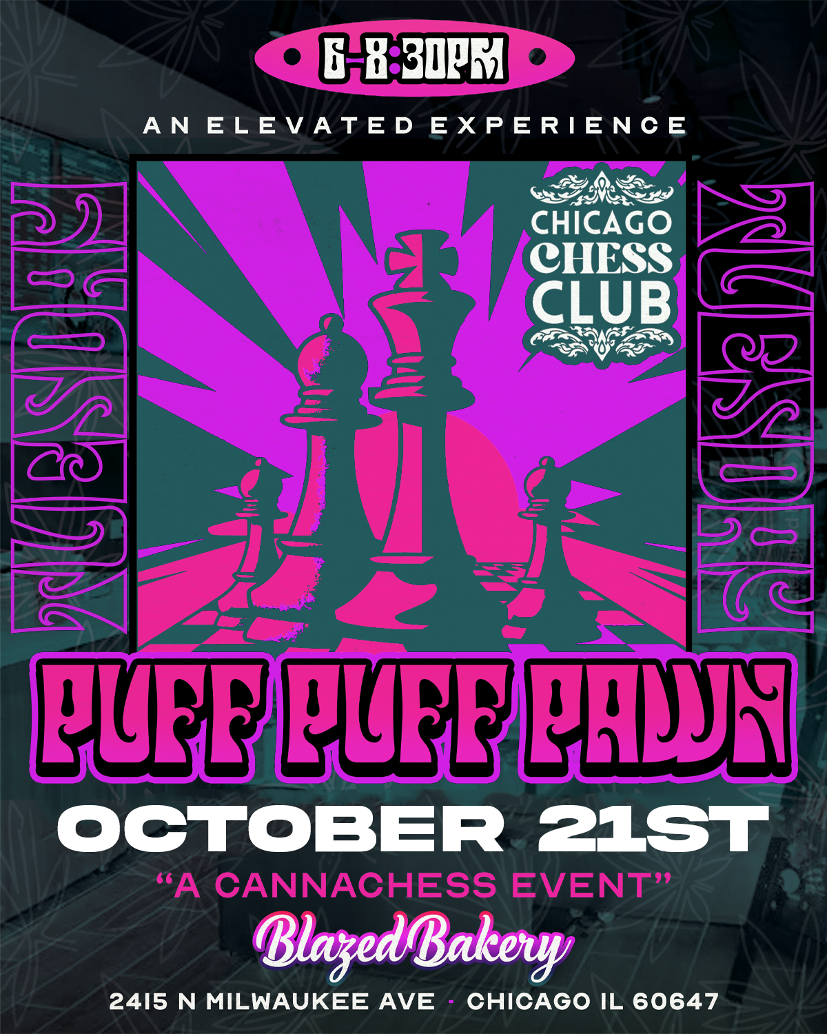 description: ♟️ Puff Puff Pawn: An Elevated Chess Night ♟️ Checkmate has never felt this lifted. 🌿👑 Blazed Bakery & Chicago Chess Club invite you to a night where strategy meets elevation. Expect vibes, laughs, and the kind of “higher thinking” that makes pawns feel like kings. ✨ The Experience: • 6:00–8:30pm → Brain games with a side of good energy • Elevated atmosphere to keep your moves flowing and your knights hopping • For seasoned pros and rookies who just call it the “horsey” • Winners brag, losers still float away happy 🌱 So pull up, level up, and see if you can plan five moves ahead when your mind is already elevated. 📍 Blazed Bakery – 2415 N Milwaukee Ave, Chicago It’s not just chess night. It’s a whole new elevation.
