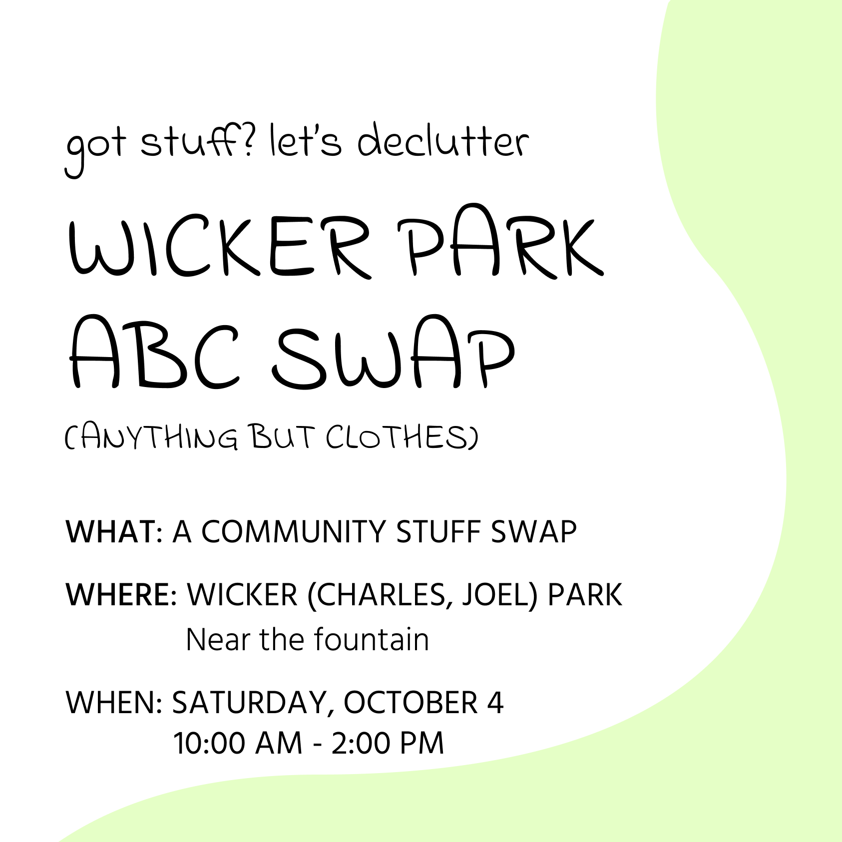 description: got stuff? let’s declutter What is an ABC swap? This is a community event aimed at reducing waste. The goal is for everyone to dispose of unwanted items and leave with something new-to-them. How do I participate? Bring a box or bag of gently used or new items that you’d like to gift. No dumping! Show up with your items (or empty-handed) & take whatever you want! What can I bring? Anything but clothes! Think kitchen gadgets, electronics, decor, pet supplies, toys, books, and more! Do NOT bring: any damaged, broken, expired, unhygienic, or soiled items. Also avoid any items that would be difficult for someone to transport like a mattress. Who is invited? Anyone is welcome! Please be respectful of neighbors & only bring items you would proudly gift to a friend. Happy swapping!