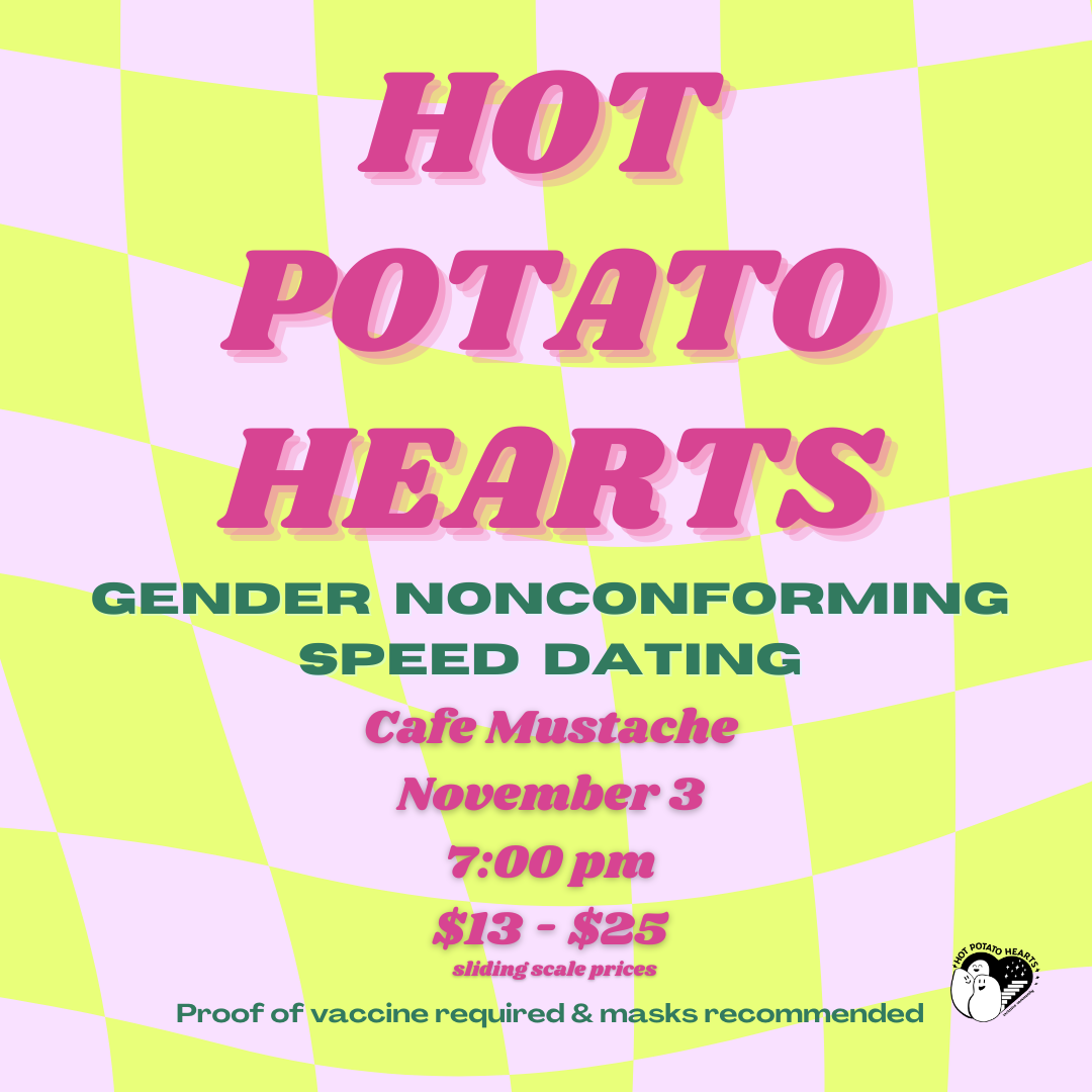 description: This speed dating event is one for all our gender nonconforming friends. This event is for Transgender & non-binary people only. Hot Potato Hearts Speed Dating is just like typical speed dating. You go on multiple 5 minute dates, anonymously write down who you like, & get emailed your matches the next day. However, at Hot Potato Hearts, we invite people of all nonconforming genders and sexualities to date. We do not pair people based on their sexual orientation; who you date is completely random, so you can get a romantic date or make some new friends! Our goal is to create a welcoming, fun, inclusive, & relaxed environment at all our events for cultivating relationships—whether romantic or platonic. Born from the heart of a queer woman, Hot Potato Hearts is & always will be a space for all genders, all sexualities, all races, & all abilities. Follow @hotpotatoheartshotpotato on Instagram for updates.