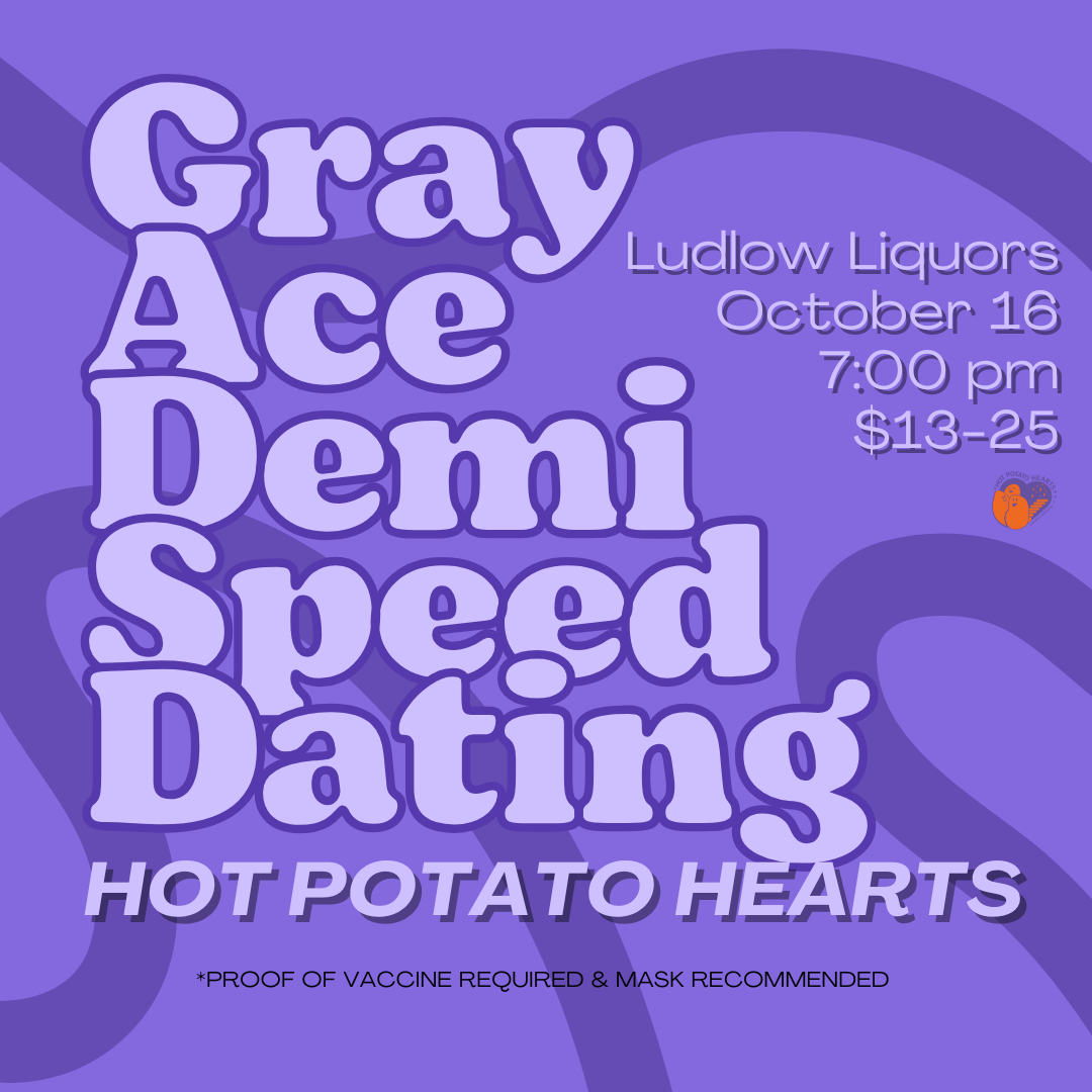 description: Hot Potato Hearts is a platform & community for people of all sexualities & expressions. We welcome Ace, Gray & Demisexuals at all our events but also understand they deserve a space just for them. Hot Potato Hearts Speed Dating is just like typical speed dating. You go on multiple 5 minute dates, anonymously write down who you like, & get emailed your matches the next day. However, at Hot Potato Hearts, we invite people of all genders and sexualities to date. We do not pair people based on their sexual orientation; who you date is completely random, so you can get a romantic date or make some new friends! Hot Potato Hearts is an inclusive community focused on building meaningful connections in low-pressure, casual safe spaces. Our goal is to create a welcoming, fun, inclusive, & relaxed environment at all our events for cultivating relationships—whether romantic or platonic. Born from the heart of a queer woman, Hot Potato Hearts is & always will be a space for all genders, all sexualities, all races, & all abilities. Follow @hotpotatoheartshotpotato on Instagram for updates.