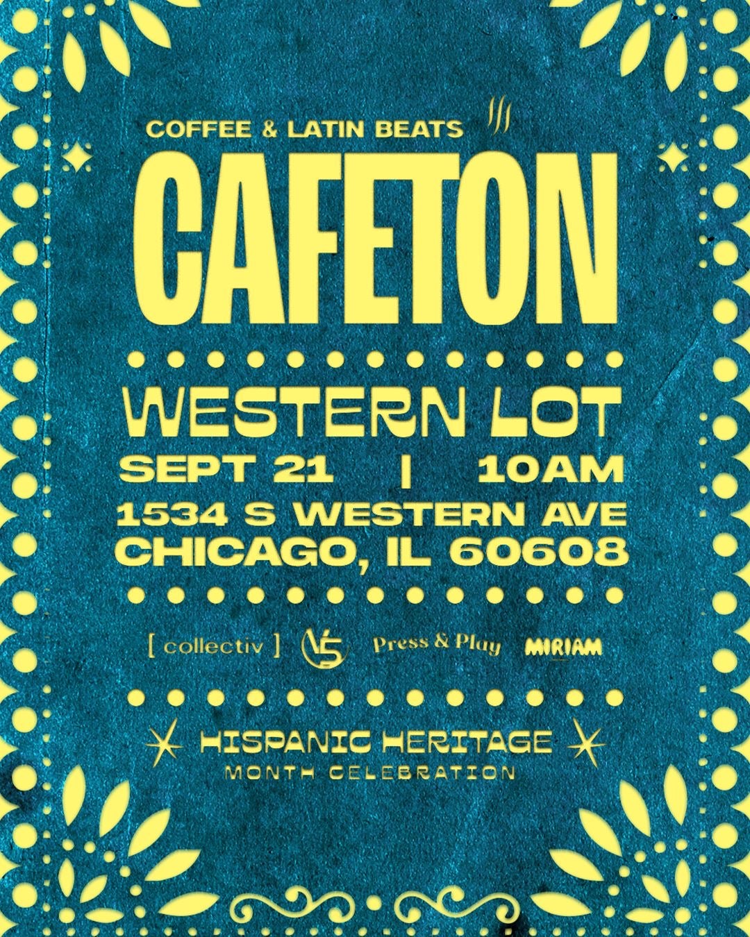 description: V5 X Collectiv X Press & Play X Miriam Presents CAFETON returns on 9/21! Coffee & Latin Beats at the new outdoor space, The Western Lot with 10 coffee vendors and 10 djs! Ages: 21+ Tucked behind the tracks in the heart of Chicago’s West Side, 1534 S Western Ave offers a raw, cinematic backdrop for Cafetón’s signature Latin experience. Surrounded by steel, concrete, and the steady rhythm of passing trains, this industrial lot transforms into a space where reggaeton, Latin trap, and global sounds collide gritty, immersive, and undeniably authentic. With its open-air layout, skyline views, and unpolished charm, the Western Lot evokes the energy of Europe’s famed warehouse raves while staying rooted in Chicago’s unique spirit. For one night only, CAFETON takes over this industrial canvas to create something truly special: a celebration of Latin culture, community, and music under the city lights.