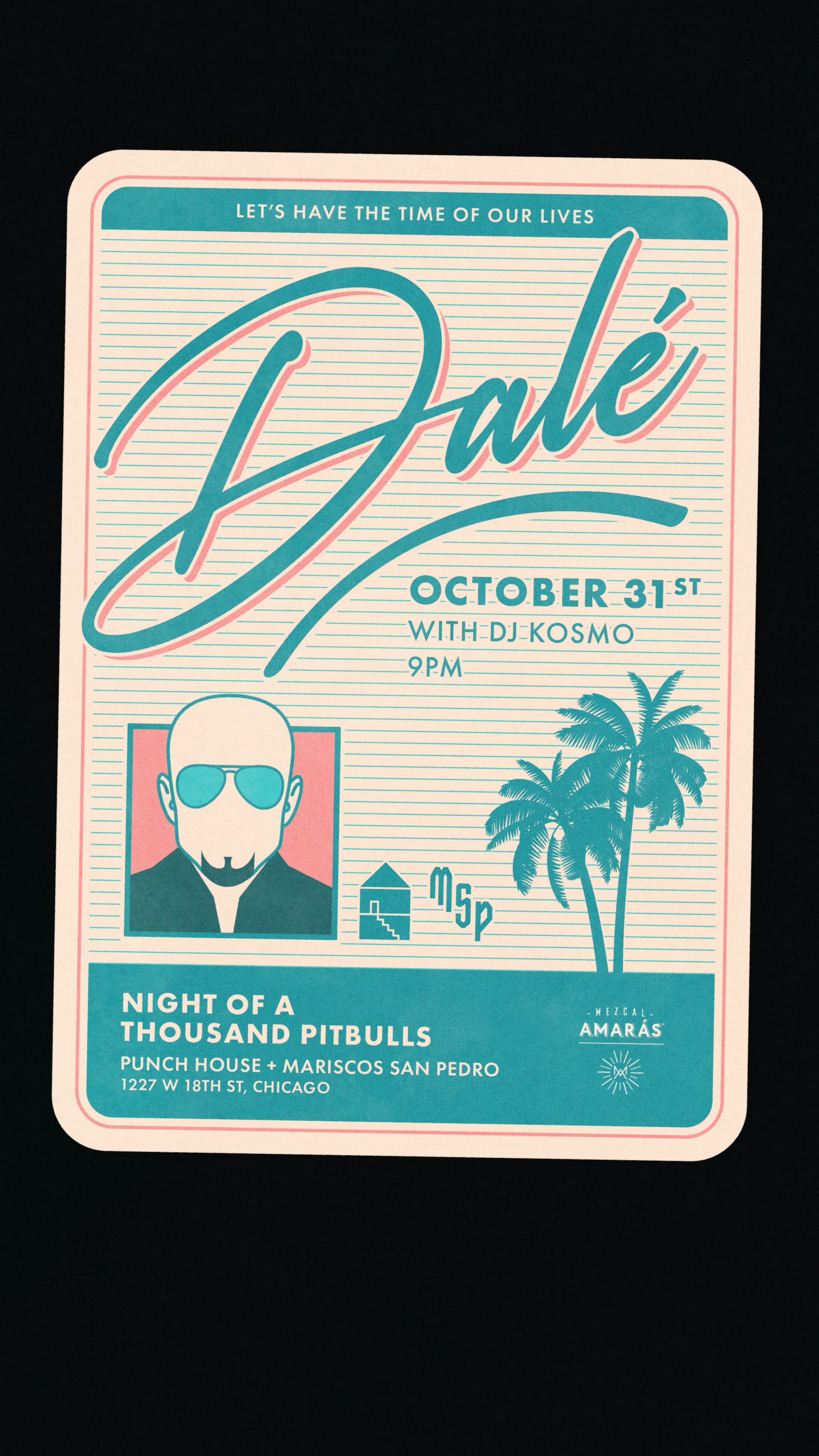 description: Join us in Punch House and Mariscos San Pedro on Halloween for Dalé, a night of a thousand Pitbulls! Enjoy specialty cocktails featuring our friends Mezcal Amarás and the musical stylings of Kosmo! Show up as your best Mr. 305 to be crowned Mr. Worldwide Chicago 2025. No costume? No problem. There will be a limited amount of Pitbull costume supplies available. Let’s have the time of our lives. No cover. No RSVP. The needle drops at 9.