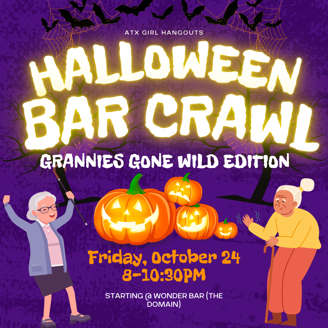 description: Ladies! Join us for our Halloween Bar Crawl: Grannies Gone Wild Edition 👵💃 on Friday, October 24 from 8–10:30PM at the Domain! This is our 3rd Annual Halloween Bar Crawl, and we’re so excited to bring back the Grannies Gone Wild theme. It was such a hit last time, and everyone’s costumes were hilarious and so much fun! 😂🎃 We’re starting at Wonder Bar and making our way through a few bars nearby, so feel free to show up anytime and stay as long as you’d like. A lot of ladies do! 🥳 How to join: Click “I’m in” below to RSVP and you’ll gain access to our group chat! Here’s our approximate schedule. We’ll post updates in the group chat as we move from bar to bar so you can easily find us! 🎃 8:00–8:45 PM at Wonder Bar 👻 8:45–9:30 PM at 77 Degrees 🕸️ 9:30–10:15 PM at Kung Fu Saloon 🧙♀️ 10:15 PM back at Wonder Bar Wear your best grannie outfit 👵, come solo (most do!) or bring a friend. We’re all just here to have fun, laugh, and meet new ladies in Austin! 💀💕