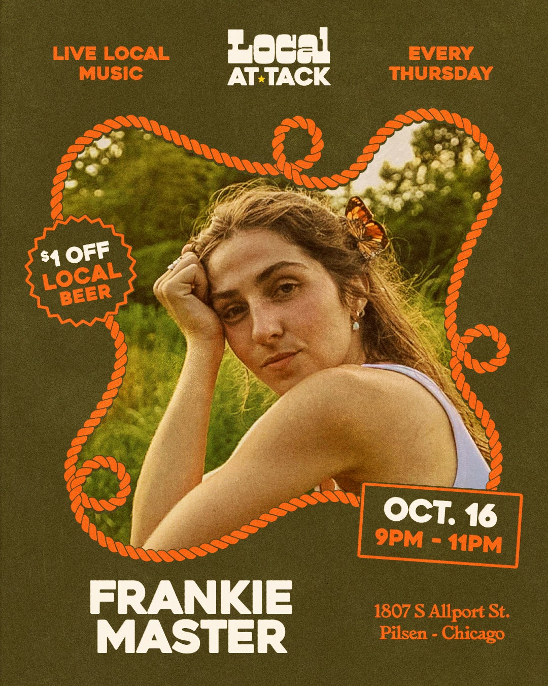 description: Join us every Thursday for local music acts & $1 off local beers. This time around there will be music from Frankie Master from 9pm-11pm. FRANKIE MASTER IS A SINGER/SONGWRITER BASED IN CHICAGO. ORIGINALLY FROM METRO DETROIT, SHE GREW UP LISTENING TO MOTOWN, SHOW TUNES, EARLY AUGHTS POP, AND 70S FOLK ROCK – MEANWHILE STUDYING CLASSICAL PIANO AND JOURNALING COMPULSIVELY FOR 10+ YEARS. AS A RESULT (PRESUMABLY), HER MUSIC IS A UNIQUE BLEND OF INDIE, SOUL, ROCK, AND POP – WARM, SINCERE, AND INTROSPECTIVE AT ITS HEART.