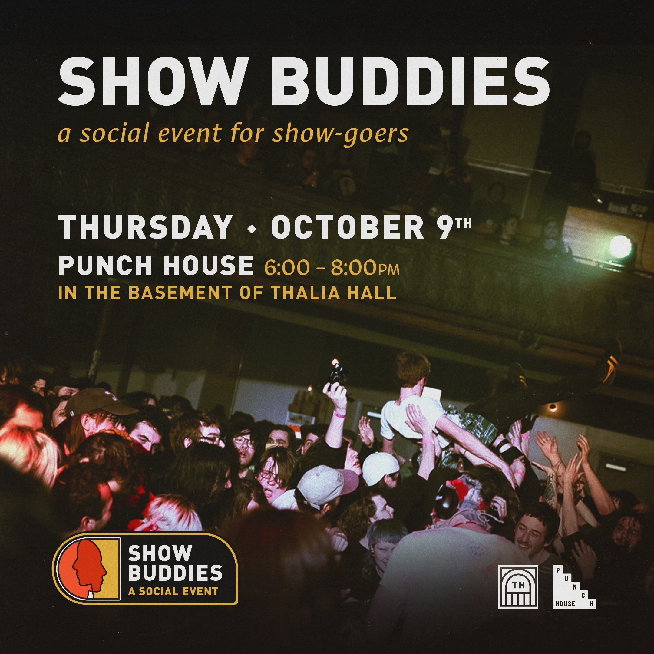 description: Looking to meet people with the same fine, fine taste in music as you? Join fellow music fans looking to expand their group of IRL concert-going friends at Thalia Hall’s SHOW BUDDIES event. If you’re going to an upcoming show here or just looking to meet some other live music lovers, join us as we get familiar with the other faces in the crowd with a live friendship event. MAKING FRIENDS IS COOL! Thursday October 9th, 6:00pm-8:00pm Punch House (basement of Thalia Hall)