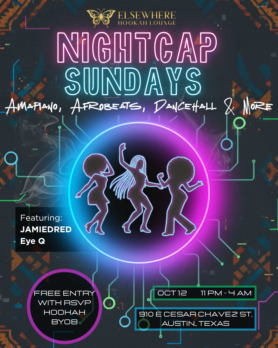 description: 🔥 Welcome to Nightcap Sundays This Sunday, we’re keeping the energy alive with Austin’s newest after-hours experience. Join us at Elsewhere Hookah Lounge for a night filled with: 🎶 Curated sounds by Jamie Dred and Eye Q 💨 Premium hookah in a laid-back lounge setting 🍹 BYOB 🤝 The perfect vibe to end your Sunday night This isn’t just another party — it’s the late-night escape you’ve been waiting for. Whether you’re sliding through after the club or starting your night late, Nightcap Sundays is the place to be. 🎟️ Tickets & Entry General Admission – Limited free RSVP (on Pie) & advance tickets available now Limited capacity — secure your spot before it sells out! 💡 Pro tip: Arrive early for the best hookah tables & to catch all the musical magic. 🔥 Mark your calendars, grab your crew, and let’s make this night an unforgettable one.