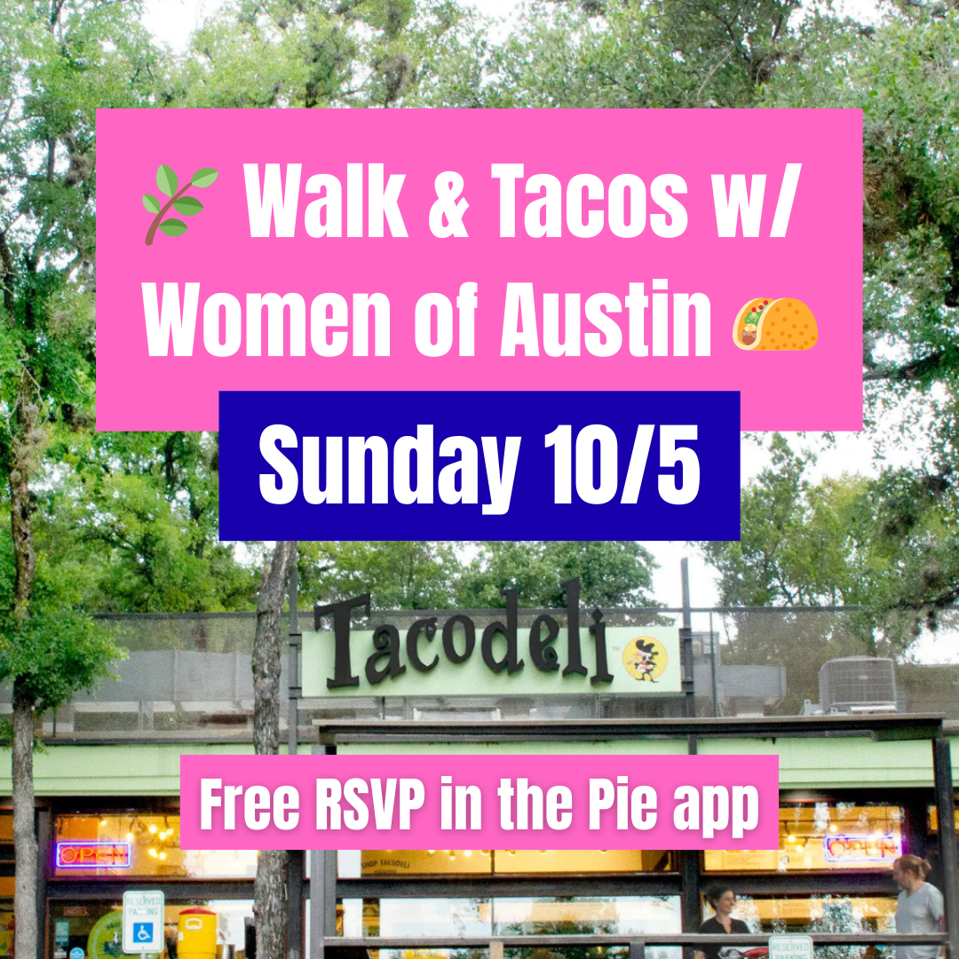 We’re meeting at the benches at the Trailhead (across the street from Taco Deli) to kick things off with a one-hour walk through the beautiful Barton Creek Greenbelt. After the walk, we’ll head back for tacos, chill time, and great conversation.