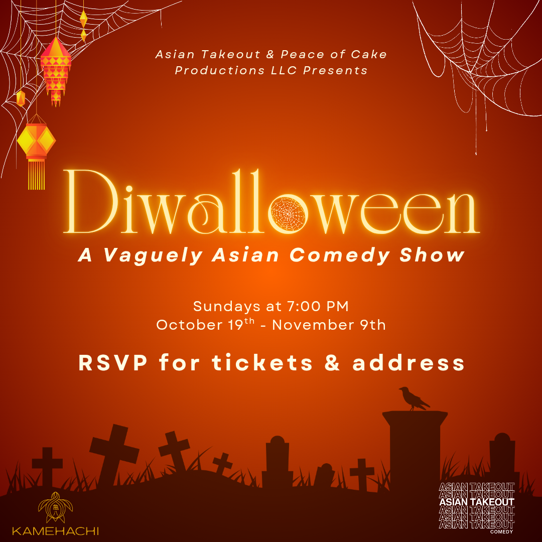 description: "Diwalloween: A Vaguely Asian Comedy Show" is an hour(ish) long original sketch show written by Asian Takeout Comedy. It tackles subjects from Diwali to Halloween to Consumerism! Asian Takeout is Chicago's premiere all-Asian comedy group. You can catch their monthly, sold-out variety show, "Today's Specials" every second Sunday at Kamehachi. Every show opens with a guest who performs anything from stand up to music to characters! We strive to highlight comedians and performers of AANHPI descent. During the show you can purchase food from our special "Asian Takeout" menu and order beverages or one of our specialty cocktails (only available at Kamehachi during our shows). We even have merch available for purchase, just ask your host! Follow us on instagram @asiantakeoutcomedy to see who our guests are each month.