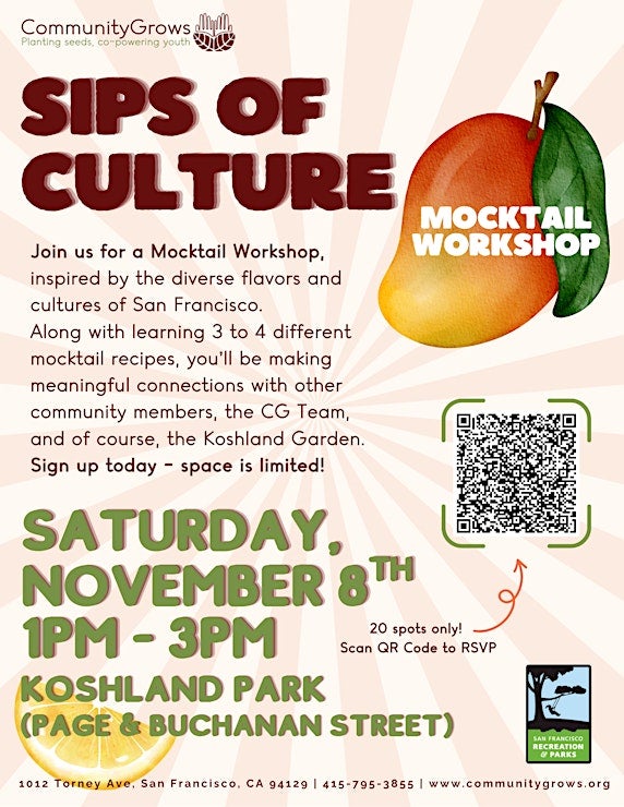 description: Welcome to Sips of Culture: Exploring San Francisco Through Mocktails in the Garden! Join us on Sunday, July 27th, 2025 at 1:00 PM PDT at Koshland Community Park and Learning Garden for our second mocktail workshop of the year. Immerse yourself in the local culture and connect with others in a relaxed and fun atmosphere. Don't miss out on this opportunity to sip, savor, and explore! Join local mixologist, Brittney Barron, on a journey to discover the vibrant flavors of San Francisco through a variety of delicious mocktails while enjoying the beauty of the garden. She’ll show you how to whip up a garden-fresh herb-infused simple syrup and mix three to four vibrant mocktails perfect for wowing your guests or enjoying at home! Immerse yourself in the local culture and connect with others in a relaxed and fun atmosphere. Don't miss out on this opportunity to sip, savor, and explore, only 20 spots available—RSVP now! https://tinyurl.com/4hz7ud8t While the event is free, we kindly welcome donations to support our garden and nutrition education programs. For questions: please contact info@communitygrows.org. Please Note: Parking is limited, so we encourage using public transportation, including bus routes 6,7, and 21 CommunityGrows is a fiscally sponsored project of Tides Center.