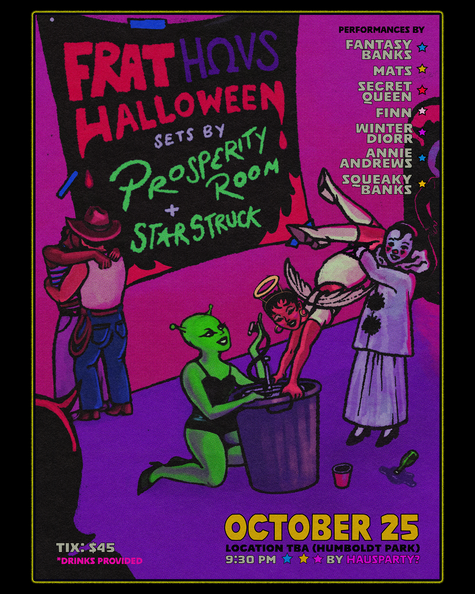 description: haus party? house party? gay frat halloween party incoming! come in your best costumes ready to dance, drink, play a bit of beer pong and maybe, if the night's going right, do a keg stand. we'll have drinks for you, come thirsty. energy drinks, sodies, and enough beer and seltzers to make Kyle from alpha phi kiss Chad. Prosperity Room will be spinning alongside Vangie. Fantasy Banks, Secret Queen, Mats, Squeaky Banks, Winter Diorr, Finn & Annie Andrews will be performing and gay people will be gaying like never before. Location TBA 2 hours prior to event to guests only. This is taking place at a venue/warehouse.21+ ONLY Tickets are non-refundable.