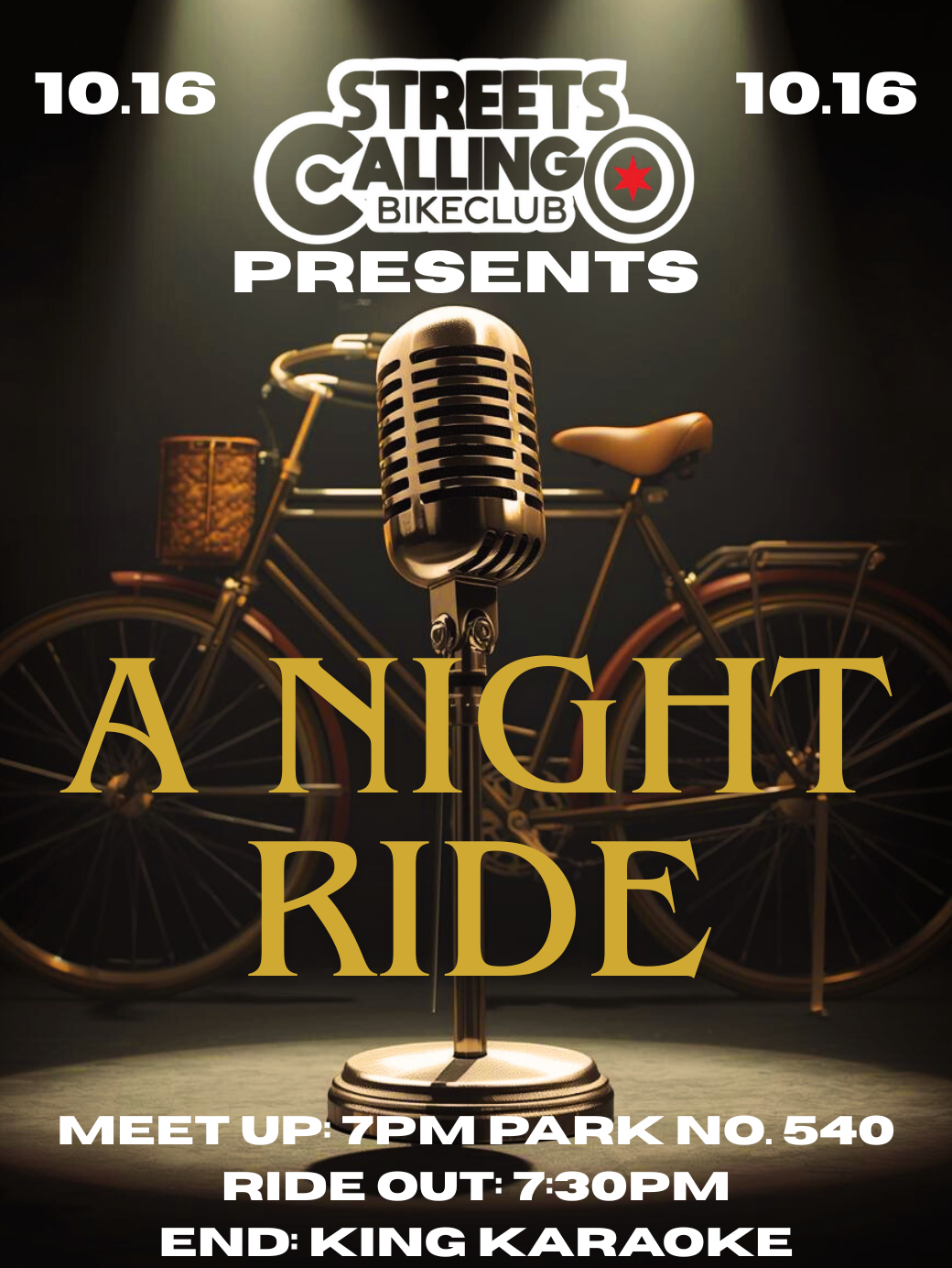 description: Meet up: 7pm Park No. 540 (2420 S Dearborn) Ride out: 7:30pm End: King Karaoke (one hour of free karaoke) 2002 S Wentworth
