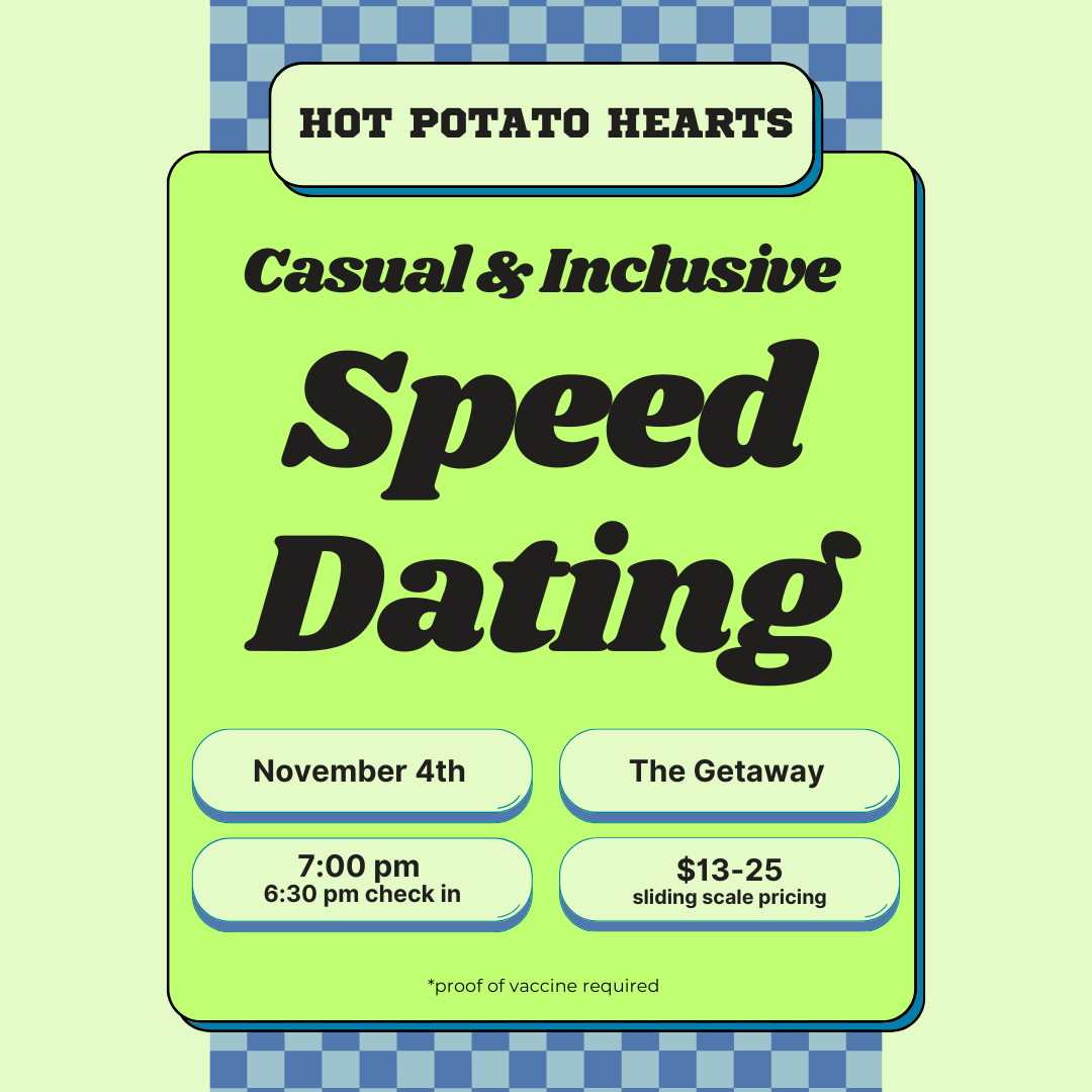 description: Hot Potato Hearts is an inclusive community focused on building meaningful connections in low-pressure, casual safe spaces. Our speed dating is just like typical speed dating. You go on multiple 5 minute dates, anonymously write down who you like, & get emailed your matches the next day. However, at Hot Potato Hearts, we invite people of all genders and sexualities to date. We do not pair people based on their sexual orientation; who you date is completely random, so you can get a romantic date or make some new friends! Our goal is to create a welcoming, fun, inclusive, & relaxed environment at all our events for cultivating relationships—whether romantic or platonic. Born from the heart of a queer woman, Hot Potato Hearts is & always will be a space for all genders, all sexualities, all races, & all abilities. Follow @hotpotatoheartshotpotato on Instagram for updates.