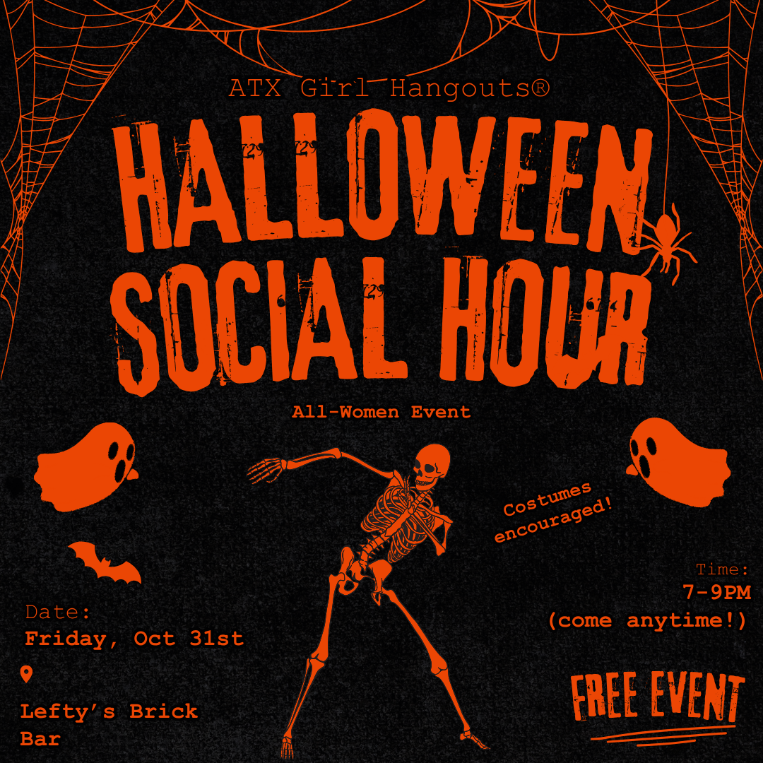 description: Ladies! 👯♀️ Get ready for a spooktacular night at our Halloween Social Hour, an all-women event! ✨ Join us on Friday, October 31 from 7-9PM at Lefty’s Brick Bar. Stop by anytime; some ladies stay longer to keep chatting! Come solo (most of us do!) or bring a friend 👯♀️ Whether you’ve lived in Austin your whole life or just moved here, this is the perfect chance to meet new women and build genuine friendships in a fun, safe, and welcoming environment 🕸️ 🎃 Costumes are encouraged, so come in your Halloween best! 👻 This is a FREE event, just RSVP to save your spot. 🥳 How to join: Click “I’m in” below to RSVP and you’ll gain access to our group chat! 🧙♀️ We’ll have some reserved tables just for us to make it easy to mingle and connect. You might even find a group to keep your Halloween night going after our event! 🕸️ When you arrive, a friendly host will welcome you and give you a name tag so you know who’s part of the event. Everyone is here for the same reason: to find friends and a supportive community in Austin. Feeling nervous or awkward? That’s totally normal! Many ladies feel more comfortable just a little into the event. 🕷️ Most attendees tell us they were nervous at first but were so glad they came. You’ll meet women who are also looking to make real friendships. We welcome ALL women from all backgrounds, ages, and walks of life 💀 Can’t wait to see you for a night of laughs, connections, and Halloween fun! 🎃🕷️