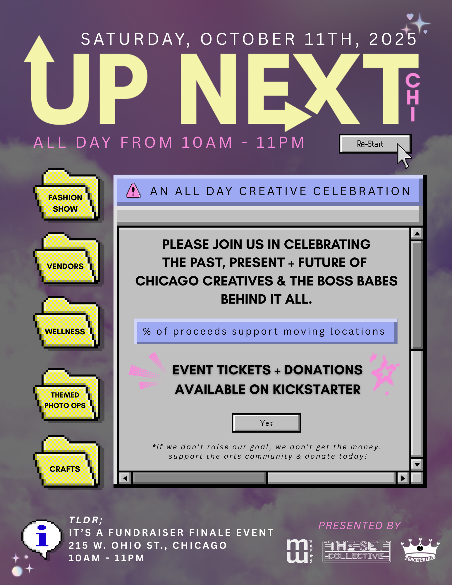 description: TICKETS AND DONATION LINK HERE: https://www.kickstarter.com/projects/cam-frank/the-set-collective-ext UP NExT CHI: A Creative Fundraiser Finale Saturday, October 11th, 2025 | 10AM–11PM 215 W. Ohio St., Chicago Join us for UP NExT CHI, an all-day creative celebration and fundraiser spotlighting the past, present, and future of Chicago’s creative scene — and the powerful women and visionaries building it. Expect: ✨ Fashion shows 🛍️ Pop-up vendor market 🧘♀️ Wellness activations 🎨 Crafts & DIY zones 📸 Themed photo ops 💖 Good vibes all day This event marks a bold transition for The SET Collective, and a percentage of all proceeds go directly toward supporting our move to a new location. 🎟️ Tickets + donations available now on Kickstarter If we don’t reach our goal, we don’t receive the funds — your support matters. Presented by: The SET Collective, MM Productions & Peach Palace