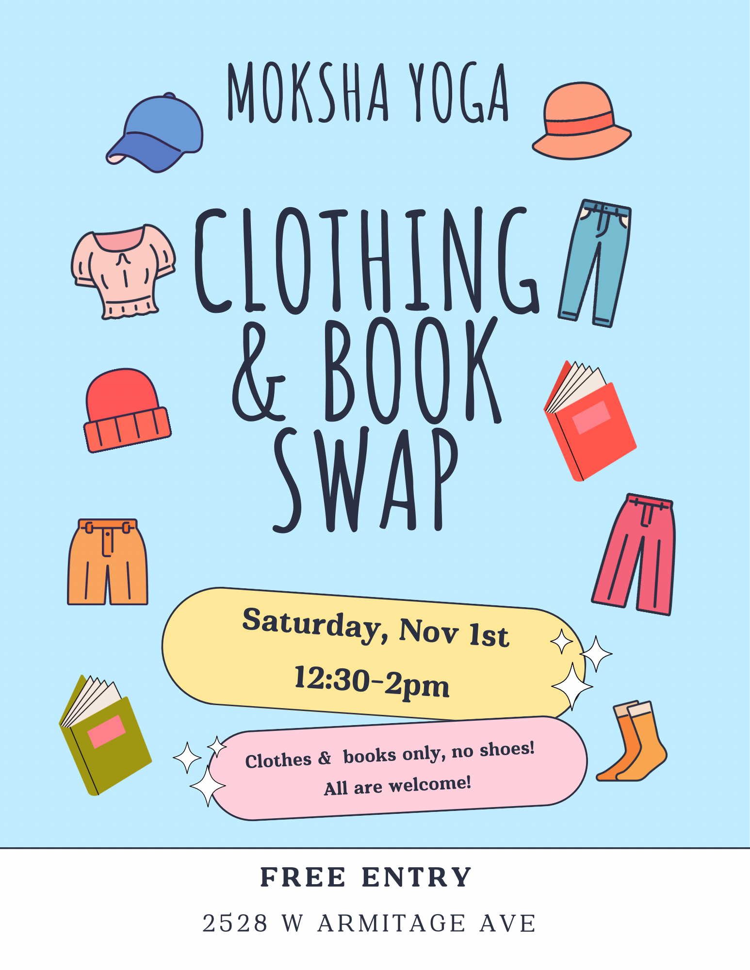description: Join Lee for a Moksha community clothing and book swap! Come by to exchange your gently used yogi clothing items to refresh your wardrobe for free, reduce textile waste, and foster connections with like-minded individuals. This is a gender inclusive clothing swap, all are welcome.Please bring clean, wearable clothes to swap for new-to-them garments, promoting sustainability and a circular economy. Tea will be provided! Any books or clothing left unclaimed will be donated. This event is immediately following Lee’s Yoga and Art Thesis Workshop!