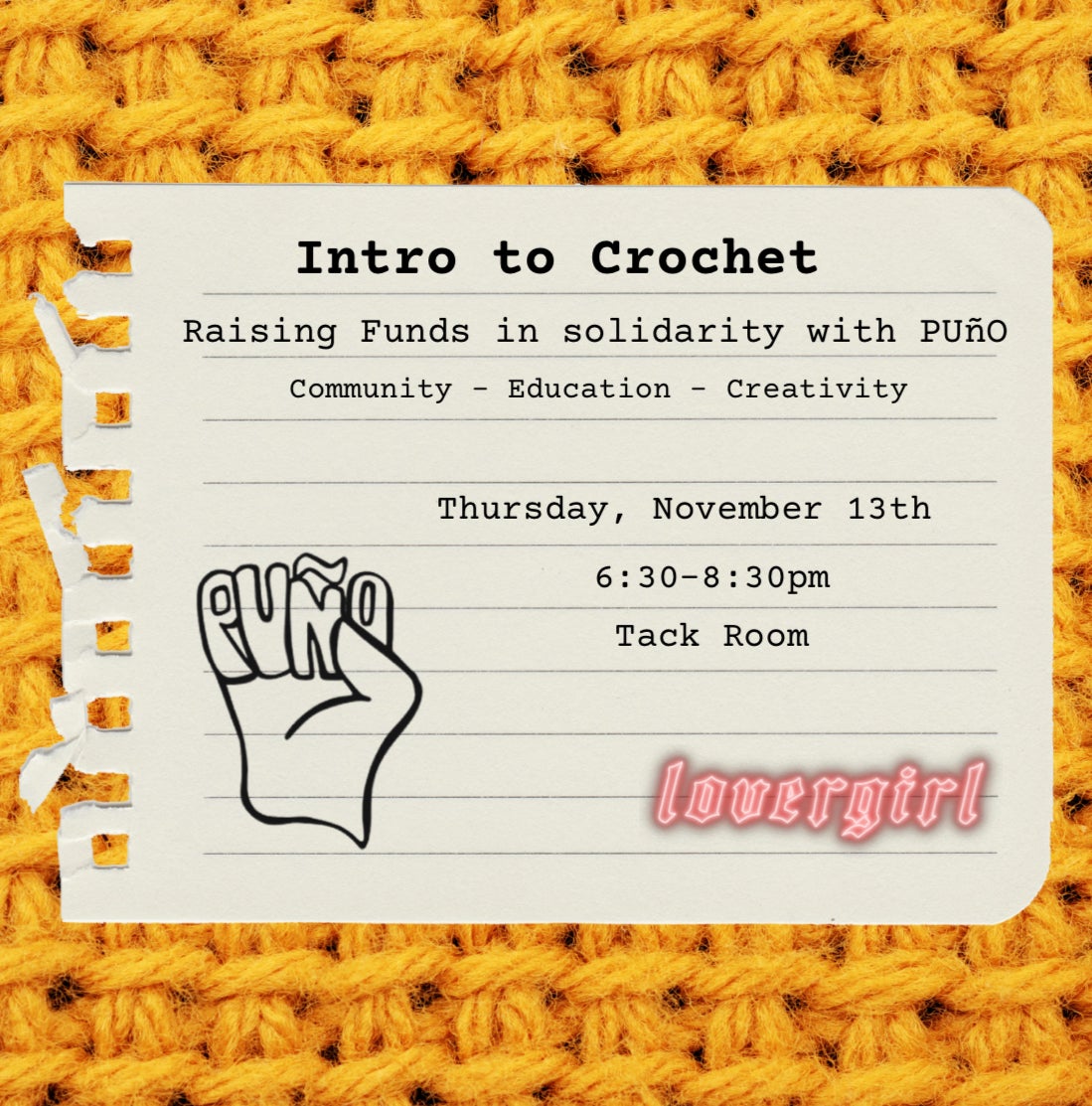 description: Being a Lovergirl is about more than making crafts with friends. It's about using the skills that we have to actively engage in community. November 13th, attend a donation-based "Introduction to Crochet" event, where you'll learn fundamentals, make new friends, and learn about ways that you can support your neighbors, while raising money for PUñO. PUñO (Pilsen Unidos por Nuestro Orgullo) is a coalition committed to advocating for the protection of immigrant rights through legal support, education, and community engagement in Pilsen and the surrounding area. We are proud to partner with them on this event and hope to uplift their mission through our space. Donation-Based tickets are now live. Don't see the price option that you are looking for available? DM us!