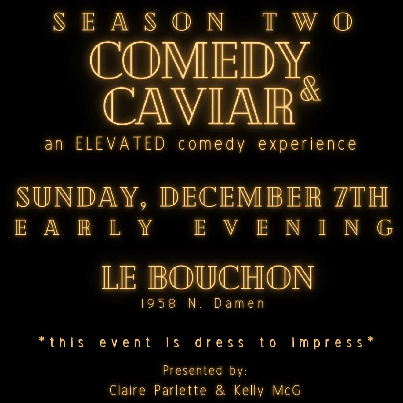 description: Join us for an indulgent evening of Comedy & Caviar, where class meets crass. Schedule: 4:30-5:30 Cocktails and Bites 5:30-6:30 Comedy Show 6:30-7:00 Nightcap $55 ticket includes: Welcome Glass of Sparkles 3 Chef Curated Bougie Bites (includes caviar bite) Additional treats available for purchase: Signature Cocktails Caviar Service Sharable Snacks Full Bar & Wine List *This is a dress to impress event. **Kindly note, Le Bouchon's main menu will not be available during this time. *** We do our best to accommodate allergies and dietary restrictions but cannot guarantee direct replacements. Purchase of ticket includes food and drink package only