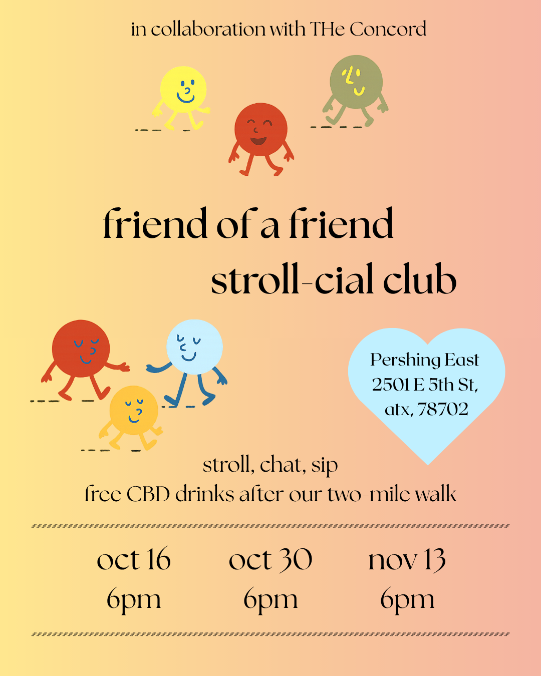 description: Let’s stroll, chat, & sip- we’ll walk 2 miles as a crew then get free CBD & Reishi Drinks at THe Concord. Meet out front of Pershing East!