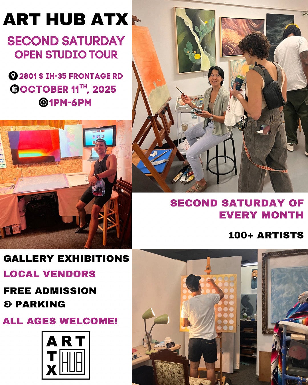 description: October means we get to go trick or treatinβ for candy AND art! π»ππ¬πΌοΈπ« ποΈ Mark your calendars for our next Second Saturday Open Studio on October 11th from 1PM-6PM! Visit the largest creative complex in Austin and experience a day filled with art, community, and culture. π Trick or treat throughout our entire studio building and get candy from each artist you meet! ποΈ ππ« Visit our neighbors at @aftpgallery and view a gallery filled with art by Austin-based artists π¦ Learn more about our ART HUB Academy and make some art with your kiddos at @ahaatx! ποΈ Admission and parking is free, and this event is open to all ages ππ§βπ§βπ§βπ§ We look forward to meeting with you all again in the heart of Austinβs creative HUB! π€ π SATURDAY, OCTOBER 11TH β° 1PM-6PM π ART HUB ATX (2801 S I-35) ποΈ Free & open to all ages!
