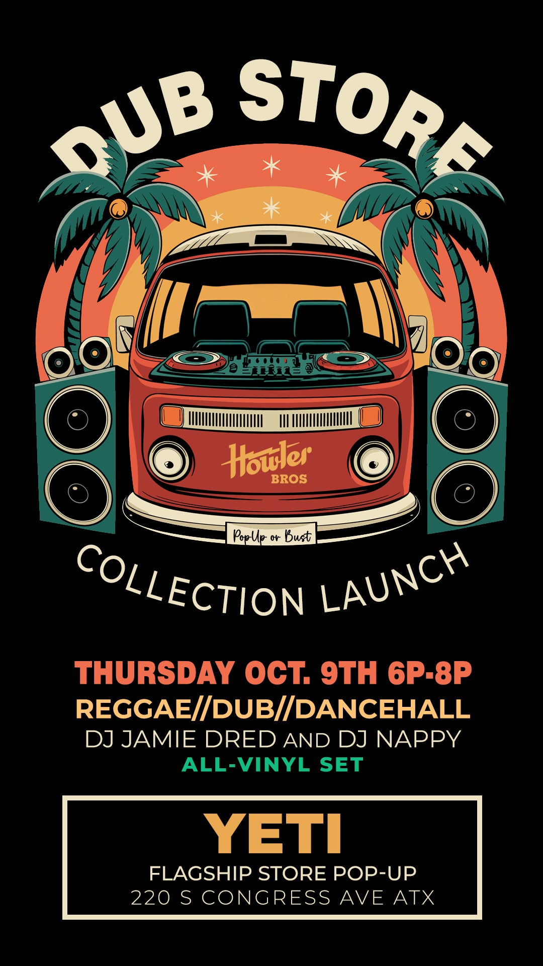 description: // DUB STORE COLLECTION LAUNCH PARTY // We’re throwing a big party over at the @yeti Flagship Store (220 S Congress) on Thursday, Oct 9th, from 6–8PM to celebrate the launch of the Dub Store Collection. Expect full-on reggae, dub and dancehall vibes: DJ @jamiedred and special guest @djnappy spinning an all-vinyl reggae set, Japanese and Jamaican-inspired food and drinks, and a special meet-and-greet with Dub Store’s legendary founder, Naoki Ienaga. All inside a custom-built Dub Store pop-up shop! Join us for this global block party right in the heart of ATX. HEED THE CALL #dubstore #reggae #howlerxyeti #buildforthewild #heedthecall