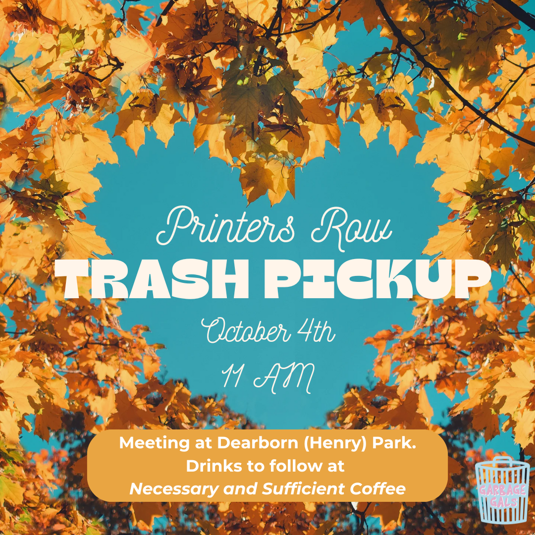 description: Hello October! Join us for our first clean up of our favorite month, in Printers Row! We are going to do a 1 hour clean up and then go to Necessary and Sufficient Coffee for drinks. WHAT WE WILL PROVIDE: We provide all the equipment/supplies necessary. That includes gloves, trash bags, buckets, and trash grabbers. WHAT TO EXPECT: We will give a 15 minute grace period for arrival. If you arrive after the designated time, please locate the nearest Garbage Gal and see if you can join them! The trash pick ups usually last about 1 hour. The Garbage Gals are not responsible for any lost items, damaged personal property, bodily injuries, or otherwise for the duration of the event. If you have any questions, please feel free to reach out to our team directly at garbagegalschicago@gmail.com We look forward to meeting and can't wait to see you there!
