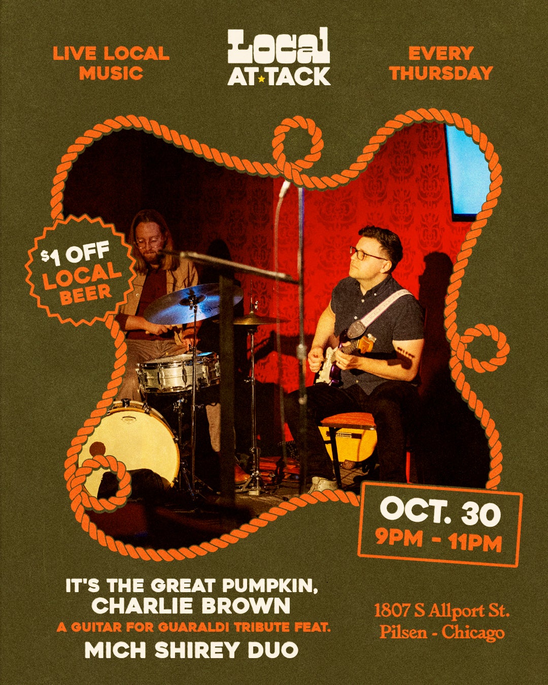 description: Join us every Thursday for local music acts & $1 off local beers. This time around there will be music from the Mich Shirey Duo from 9pm-11pm. GUITAR FOR GUARALDI IS AN ANNUAL CONCERT SERIES TO HONOR THE WORK OF VINCE GUARALDI, FEATURING THE MICH SHIREY DUO PERFORMING TRUE-TO-FORM GUITAR ARRANGEMENTS OF THE SOUNDTRACK FROM THE TIMELESS PEANUTS HALLOWEEN SPECIAL.THIS SHOW PROMISES TO BRING THE SAME COZY SPIRIT TO THE FALL SEASON THAT THEIR CHRISTMAS SERIES SHARES EACH YEAR.