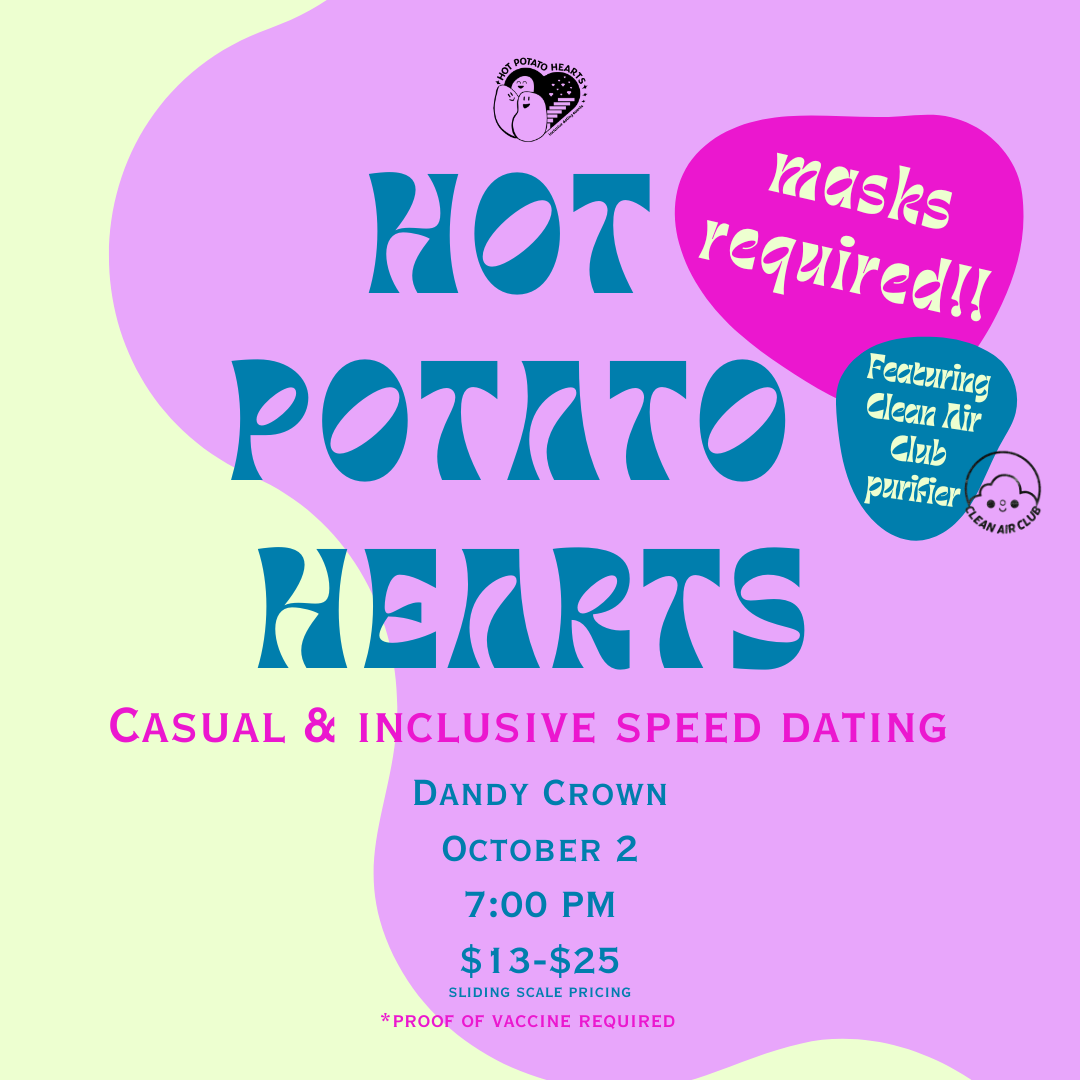 description: Here at Hot Potato Hearts we prioritize safety while dating & host a reoccurring series MASKS REQUIRED SPEED DATING!!!! This event will also features a air purifier from Clean Air Club :) Hot Potato Hearts Speed Dating is just like typical speed dating. You go on multiple 5 minute dates, anonymously write down who you like, & get emailed your matches the next day. However, at Hot Potato Hearts, we invite people of all genders and sexualities to date. We do not pair people based on their sexual orientation; who you date is completely random, so you can get a romantic date or make some new friends! Hot Potato Hearts is an inclusive community focused on building meaningful connections in low-pressure, casual safe spaces. Our goal is to create a welcoming, fun, inclusive, & relaxed environment at all our events for cultivating relationships—whether romantic or platonic. Born from the heart of a queer woman, Hot Potato Hearts is & always will be a space for all genders, all sexualities, all races, & all abilities. Follow @hotpotatoheartshotpotato on Instagram for updates.