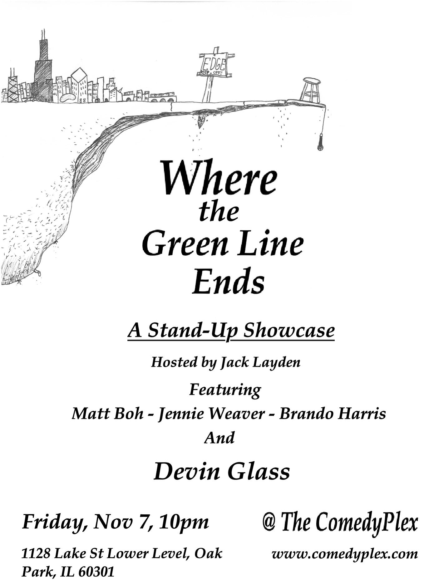 description: Where the Green Line Ends! Come see some of the Chicagolands funniest comedians falling up! A new late night Stand-Up Comedy Showcase in Oak Park, IL, right off the last green line stop! $10/$5 with College ID | Hosted by Jack Layden Featuring: Matt Boh Jennie Weaver Brando Harris Devin Glass Drink Special $10 Margaritas! $3 Fireball Shots $3 Hamms Beers *2 Drink Minimum Per Person *21 and over unless accompanied by an adult Cheap Parking in Holley Court Garage Outside food welcome