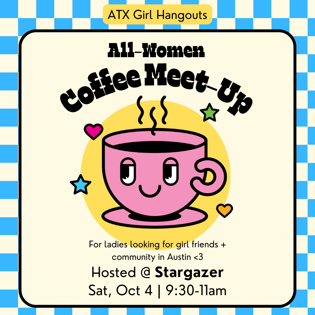 description: Ladies! ☕👯♀️ Join us for a FREE All-Women Coffee Meet-Up on Saturday, October 4 from 9:30-11AM at Stargazer! Come anytime. We’ll be there until 11AM, ready to welcome you with smiles and name tags. 💖 ✨ You’ll spot our ATX Girl Hangouts table sign and our host ready to greet you. Everyone here is looking for the same thing: friends and a community in Austin. It’s totally normal to feel nervous or awkward. Coming is courageous and we’re here to help you feel comfortable! 💌 How to join: Click “I’m in” below to RSVP and you’ll gain access to our group chat! 💖 Lots of ladies tell us they were nervous at first but by the end they felt so glad they came and started making connections right away. This is your chance to meet new women, chat over coffee, and build real friendships in a warm, welcoming space. We welcome ALL women from every age, background, and walk of life. 💕 Come solo (most of us do!) or bring a friend. Either way, you’ll leave with new connections and a full heart! We can’t wait to see you there! 🫶☕🎉