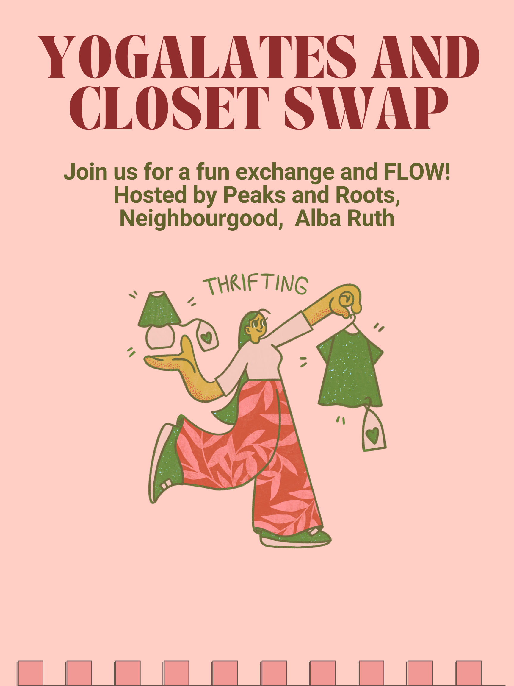 description: Yoga + Clothes Swap with Peaks and Roots, Alba and Neighbourgood π Saturday, October 19th π 11:00 AM Schedule: 11:00β11:15 AM - Check-in 11:15β12:00 PM - Grounding yoga practice 12:00 - Clothes swap + free food and drinks What to Bring: Gently used clothes, shoes, accessories, jackets, etc in good condition to contribute to the swap A yoga mat for practice Come move with us, refresh your wardrobe sustainably, and share food, drinks, and connection.